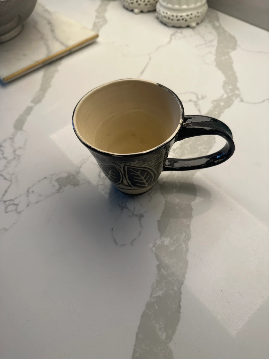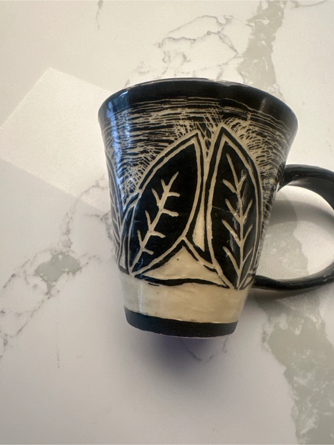 Selling a unique handmade ceramic mug! It features a lovely leaf design in black and white. Perfect for your morning coffee or tea! It's in great condition, ready for a new home