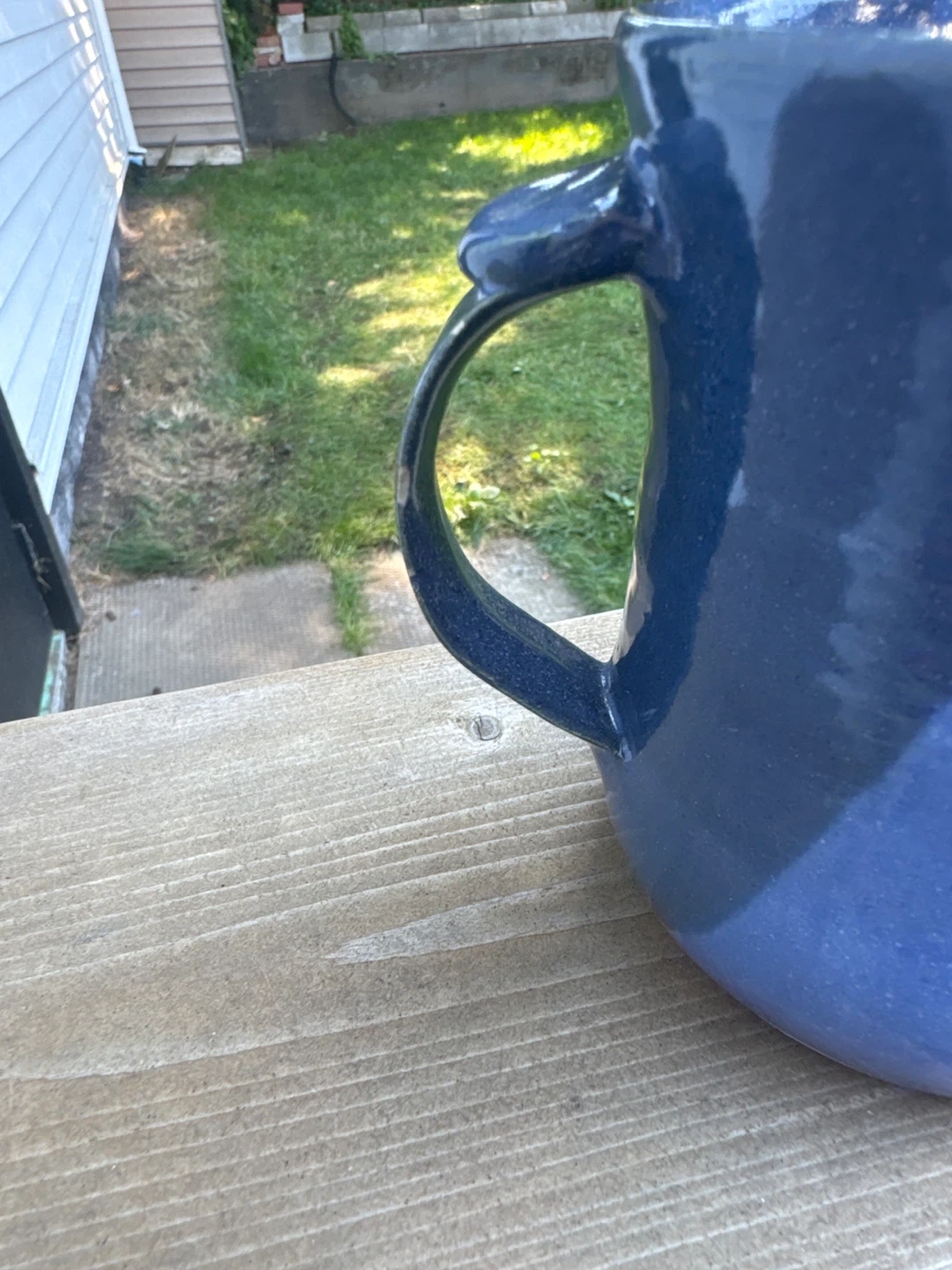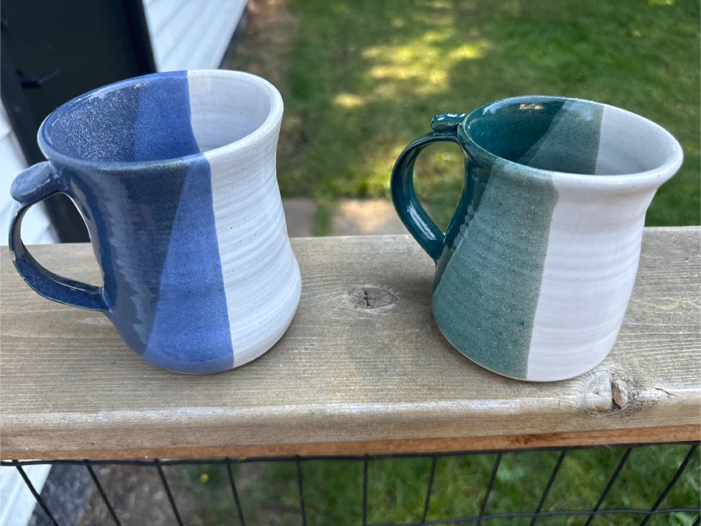 I'm selling a set of two handmade ceramic mugs. One mug is blue and white, and the other is green and white. They are in great condition - one small chip as shown and ready for your morning coffee or tea!