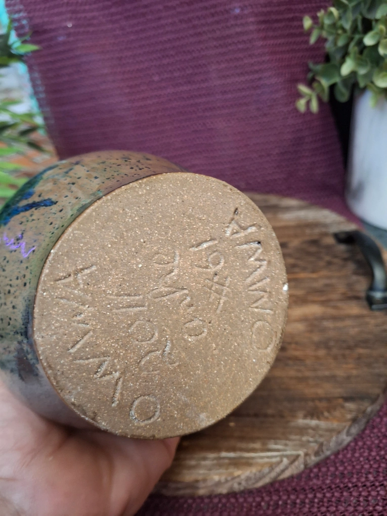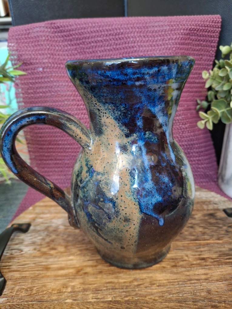 Beautiful handmade ceramic pitcher in shades of blue and brown. It's in great condition and would look lovely on any table or shelf.