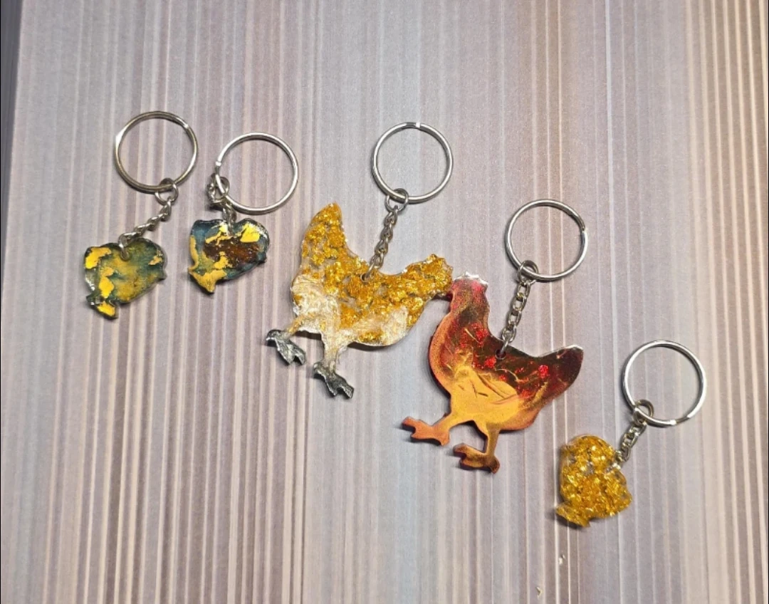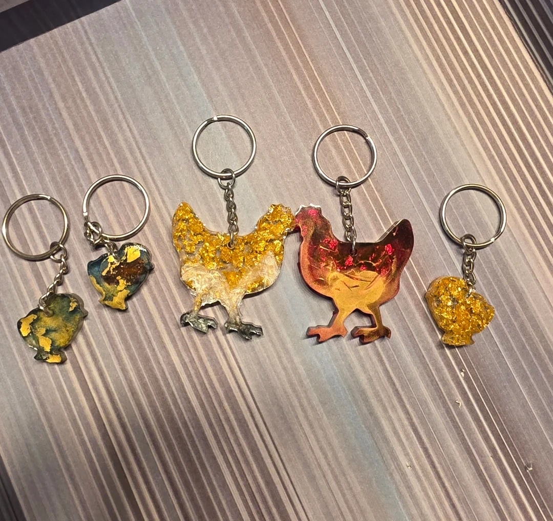 5Selling a set of handmade resin keychains! They feature cute chicken designs and are perfect for adding a touch of whimsy to your keys or bags. Perfect gift for the entire family! $7 for chicken each $5 for the baby chick each Or buy the entire family for only $20!!
