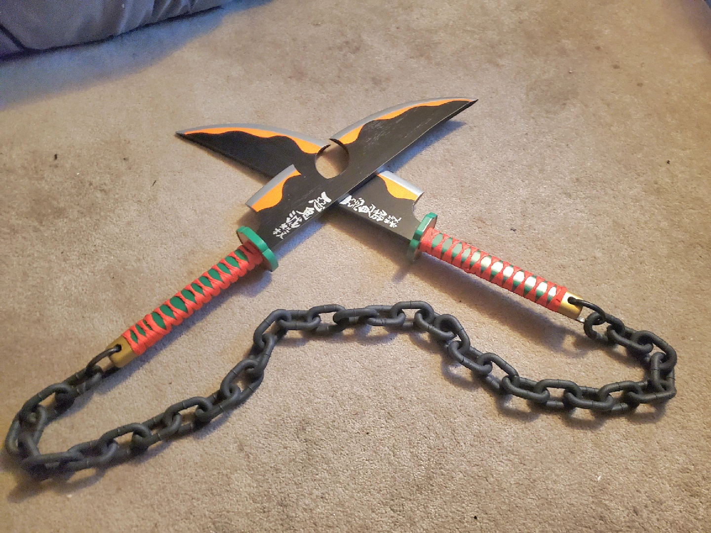 Handmade Wooden Copslay props! to perfect your cosplay or be an amazing wallpiece addition in your living room. these Demon Slayer Uzui blades specifically are 120$. My standard prices is 90$ for any design of katana you'd like, and you get a sheath with it ! (all/most items shown in photos here are already sold and with the customers. I can recreate anything you see though ๐)