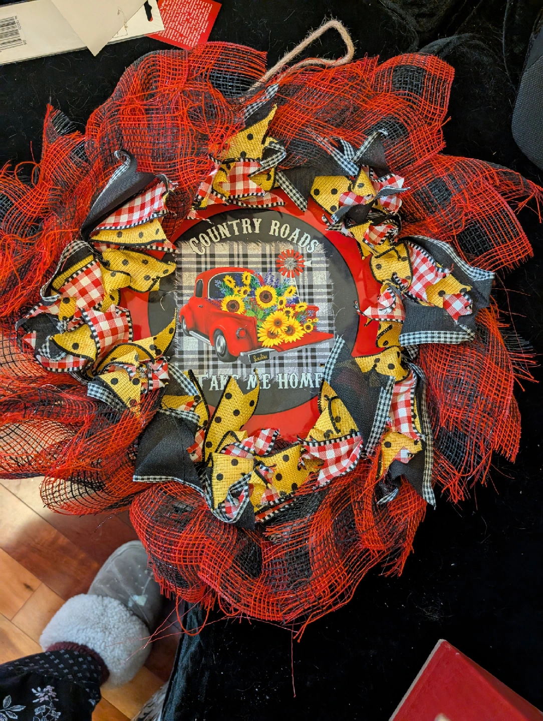 Selling a handmade wreath with a 'Country Roads, Take Me Home' theme. It features a red truck with sunflowers and a mix of red, black, and yellow checkered ribbons. Perfect for adding a touch of country charm to your home! never used