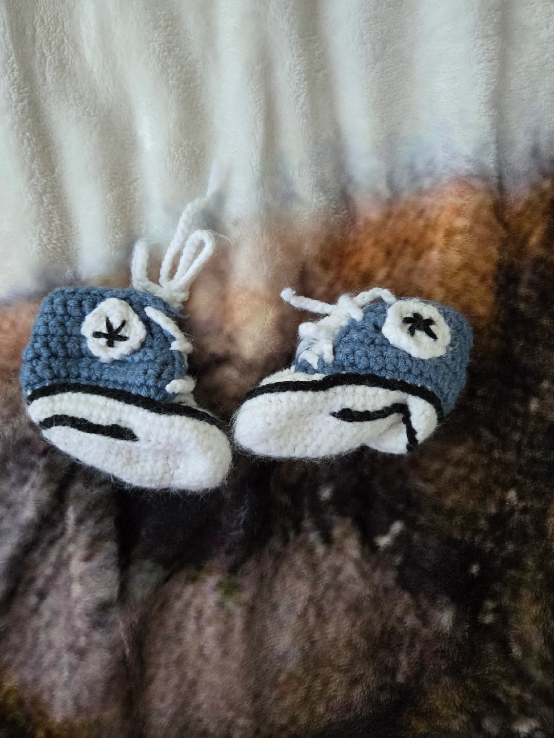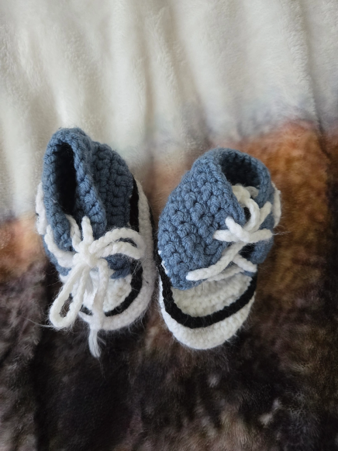 60These adorable baby booties are handmade with love! They're a soft, cozy, and unique gift for a newborn. The booties are crocheted in a charming blue and white colour scheme with cute little laces. Perfect for keeping tiny toes warm!