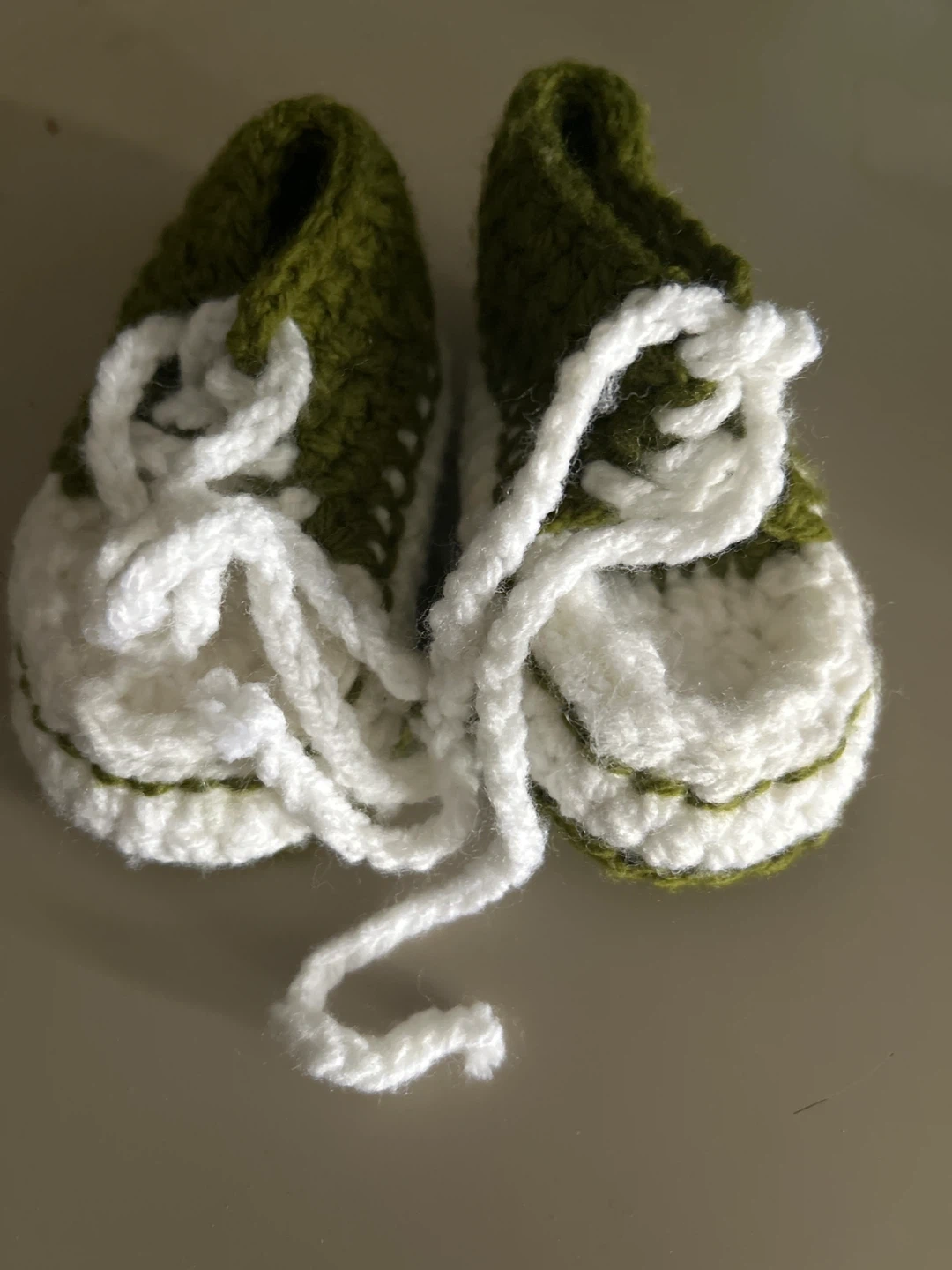 154These adorable handmade crochet baby booties are perfect for keeping your little one's feet warm and cozy! They feature a cute design in green and white, with little laces to keep them snug. These would make a lovely gift for a newborn or a baby shower