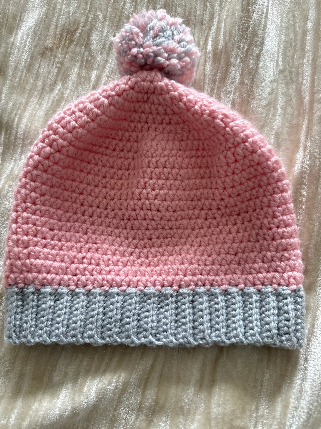 Adorable handmade crochet baby hat. Features a pink body, grey cuff, and a fluffy pom-pom. Perfect for keeping baby warm and cozy.