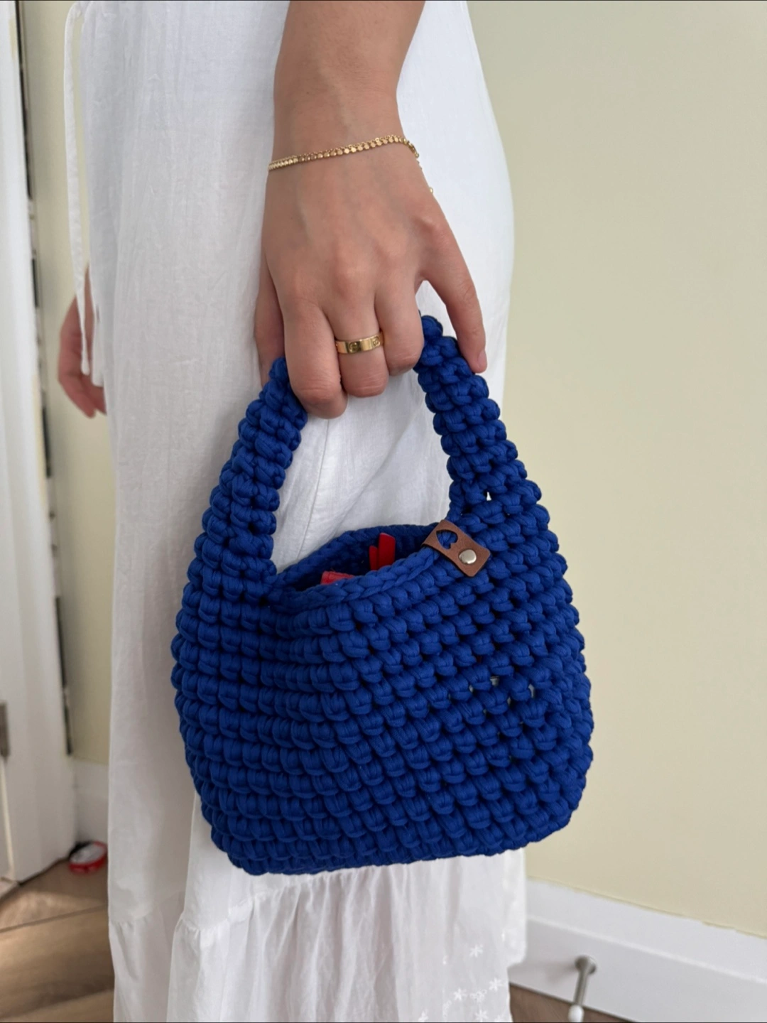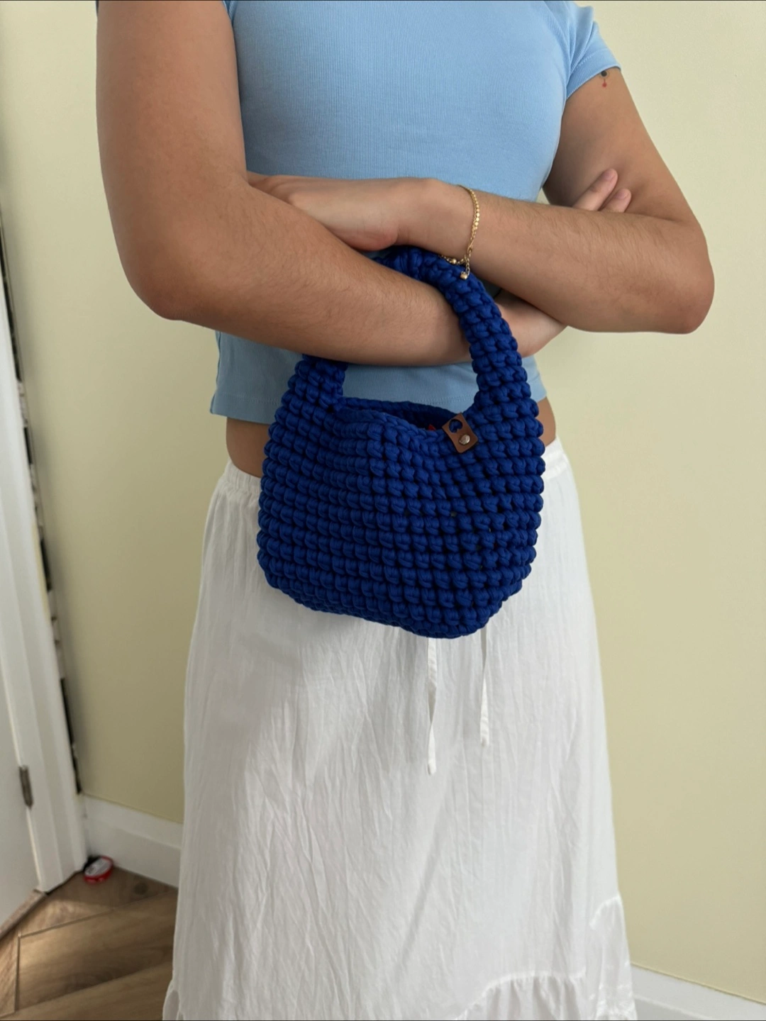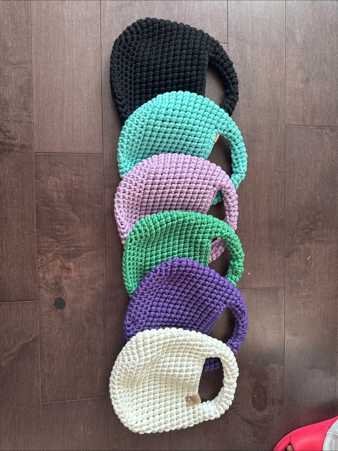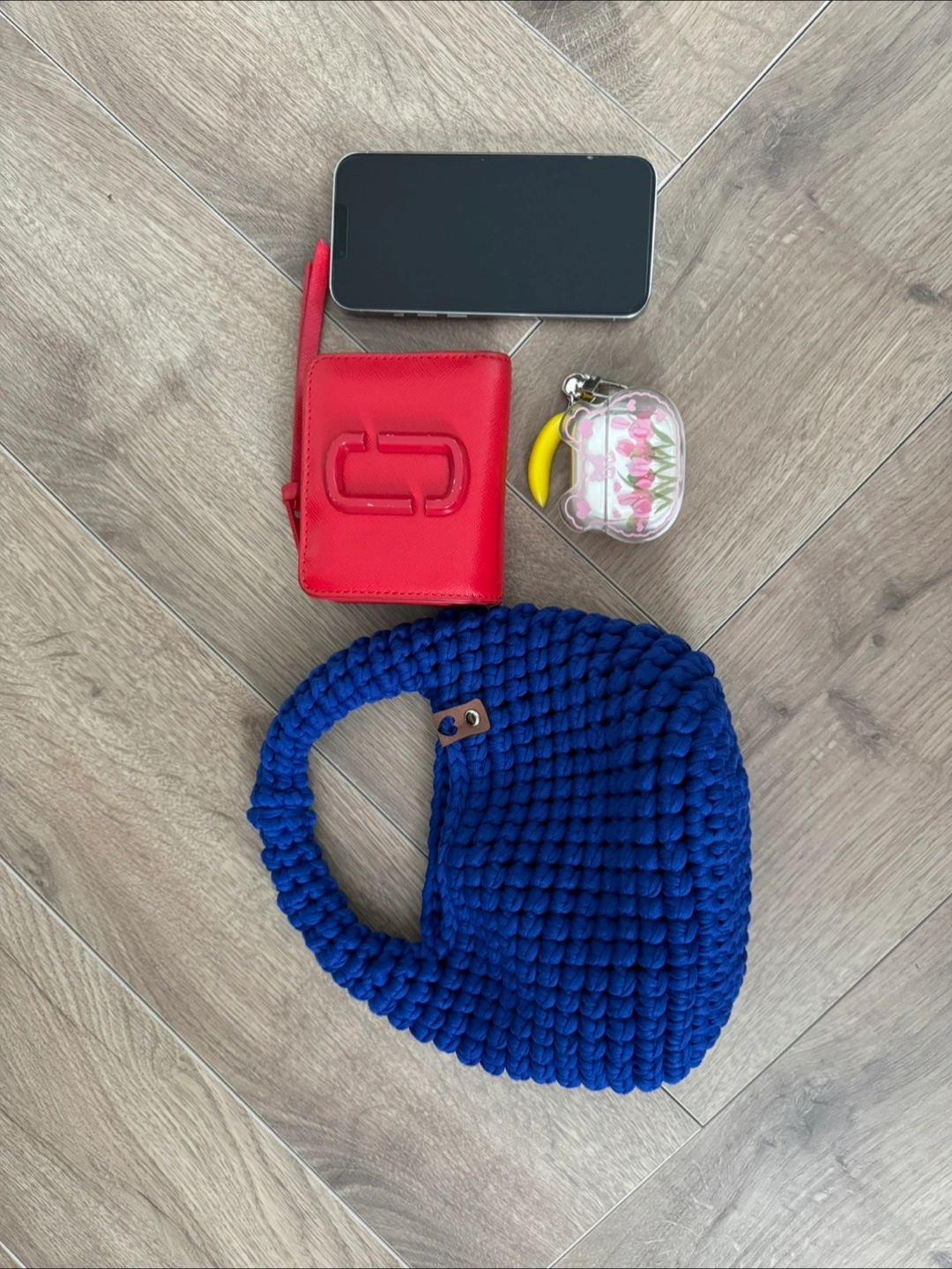 116Handmade crochet bag available in various colours (shown above in last picture) Material is jersey yarn, flexible and sturdy, and doesn’t create lint balls Small size fits a wallet, phone and airpods/car keys