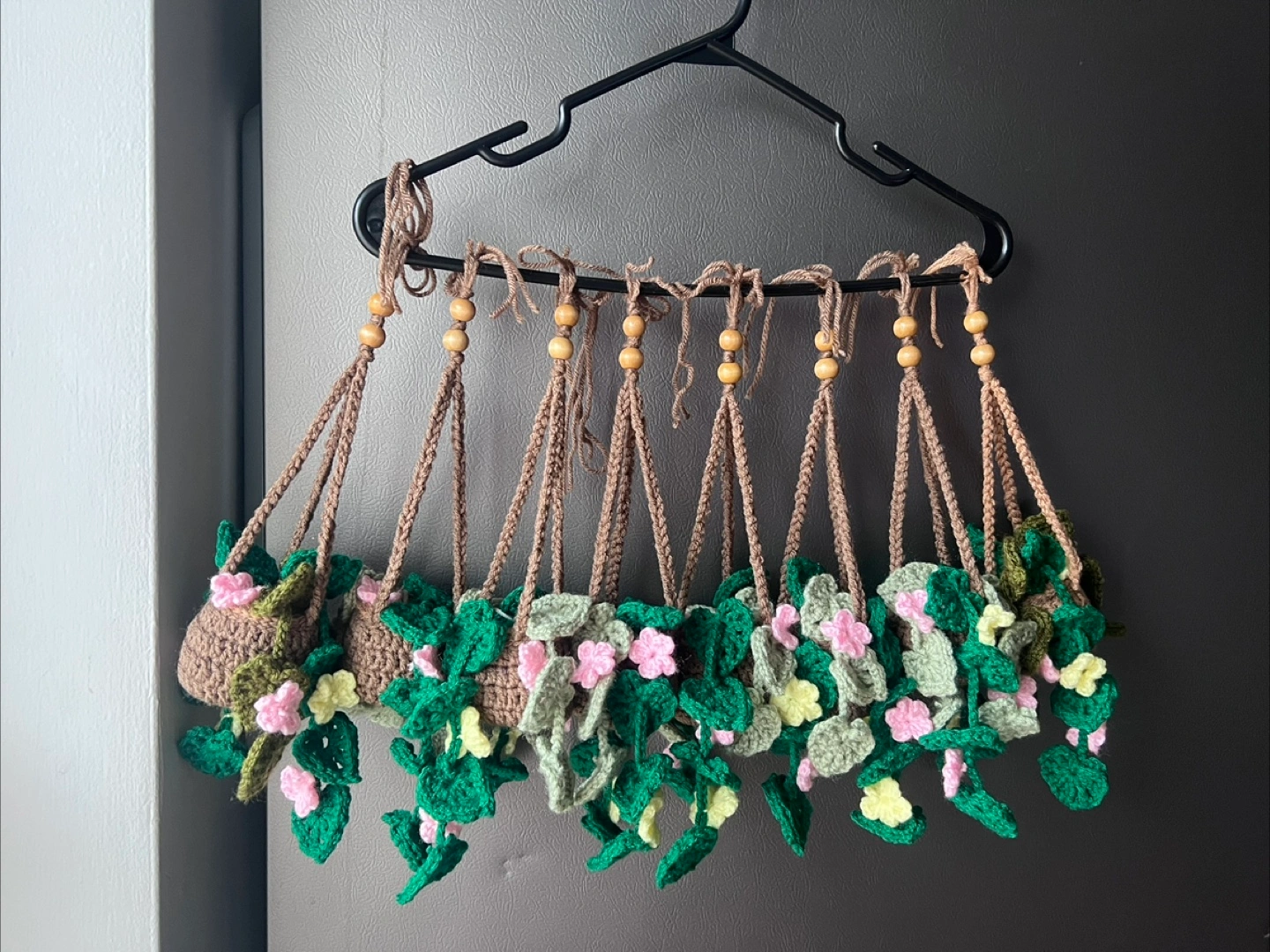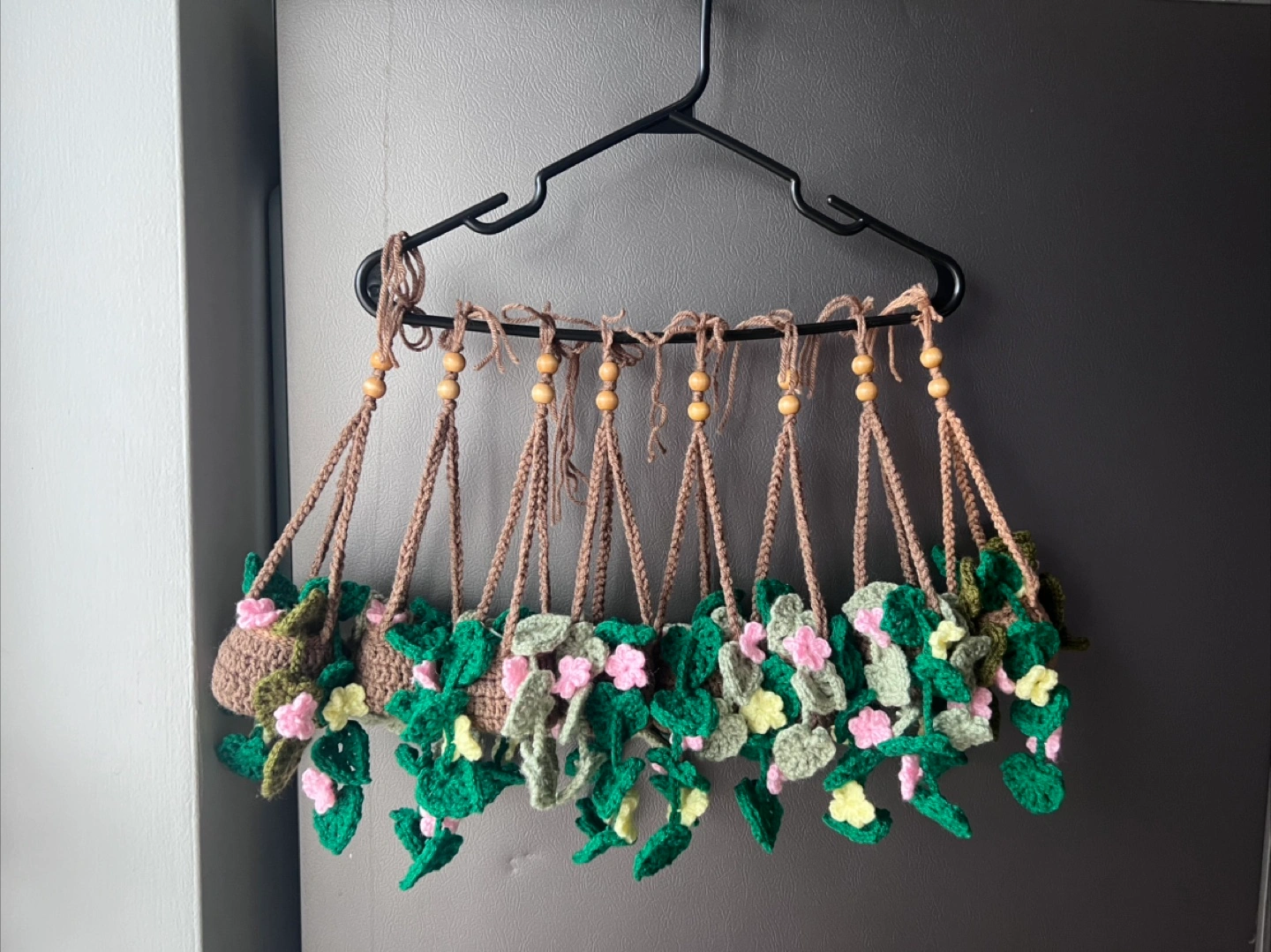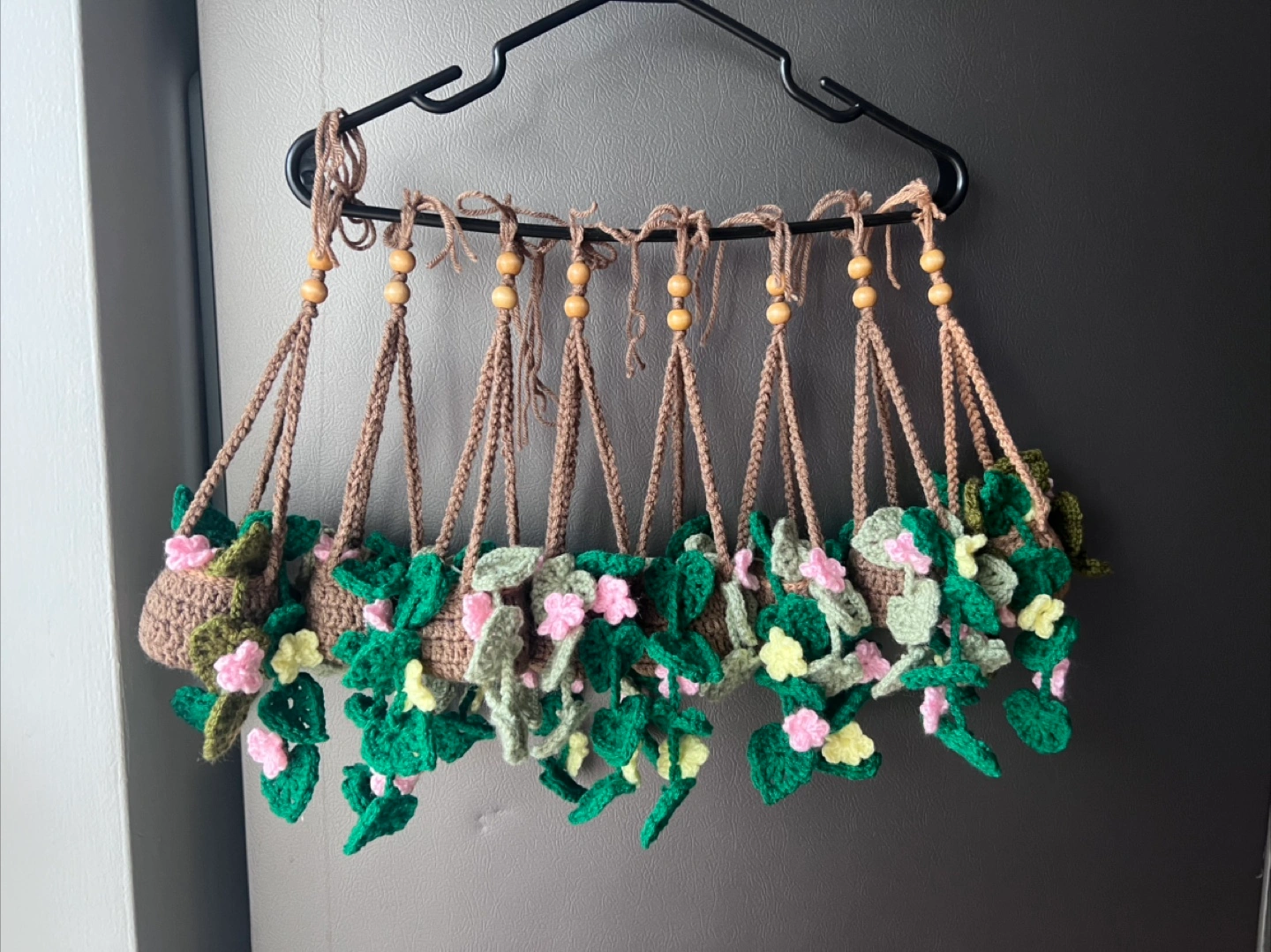 I'm selling a set of handmade crochet flower basket . They have a cute, rustic look with wooden beads and little crocheted plants with pink flowers. Perfect for adding a touch of handmade charm to your home! Perfect gift for friends and kids …