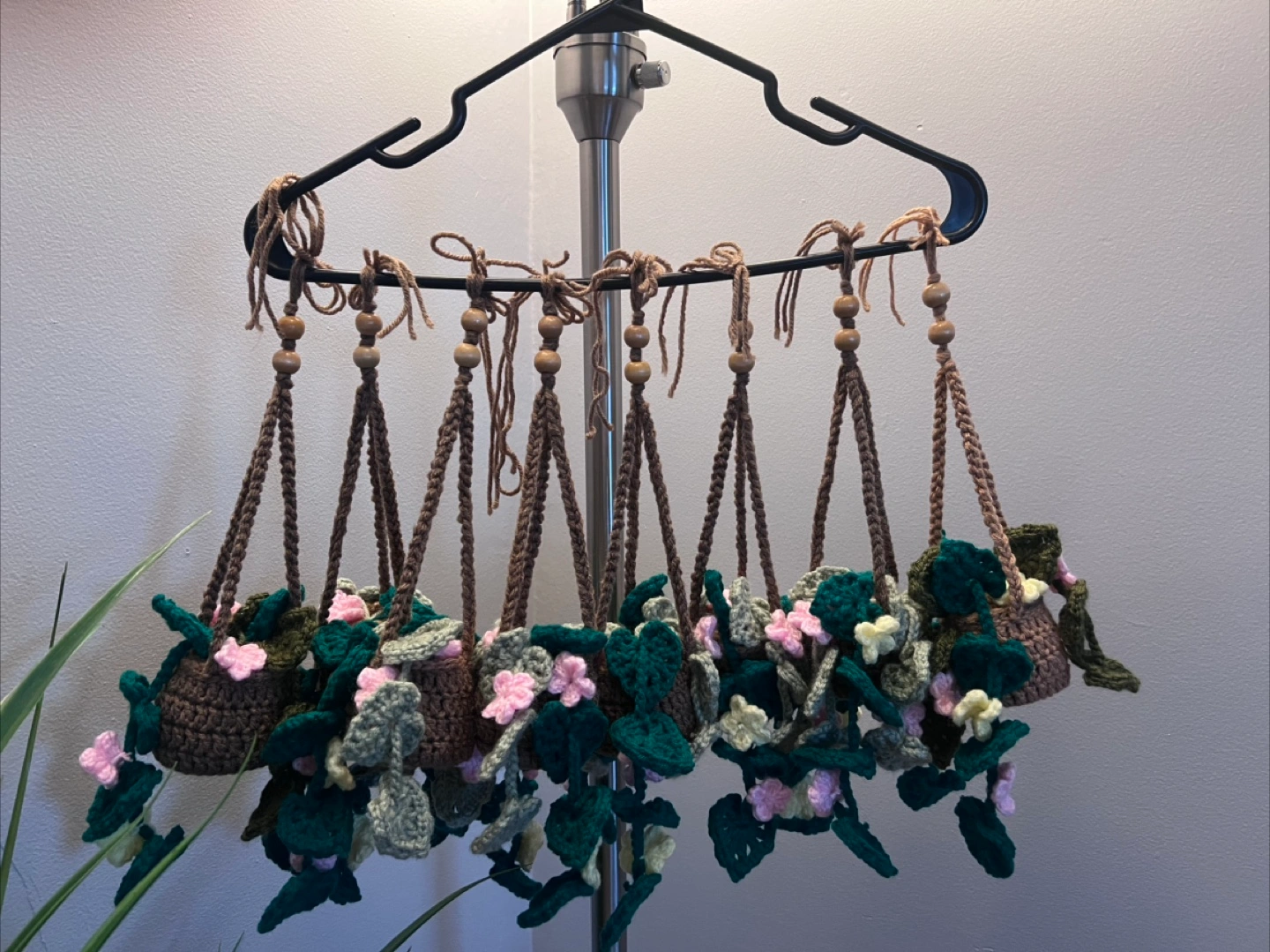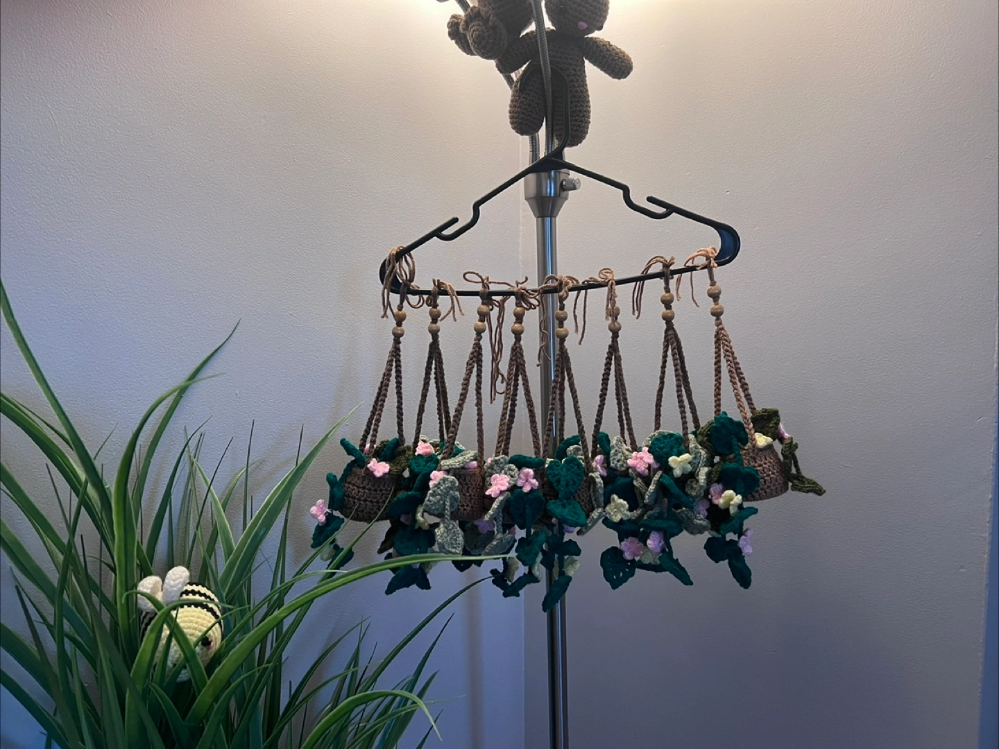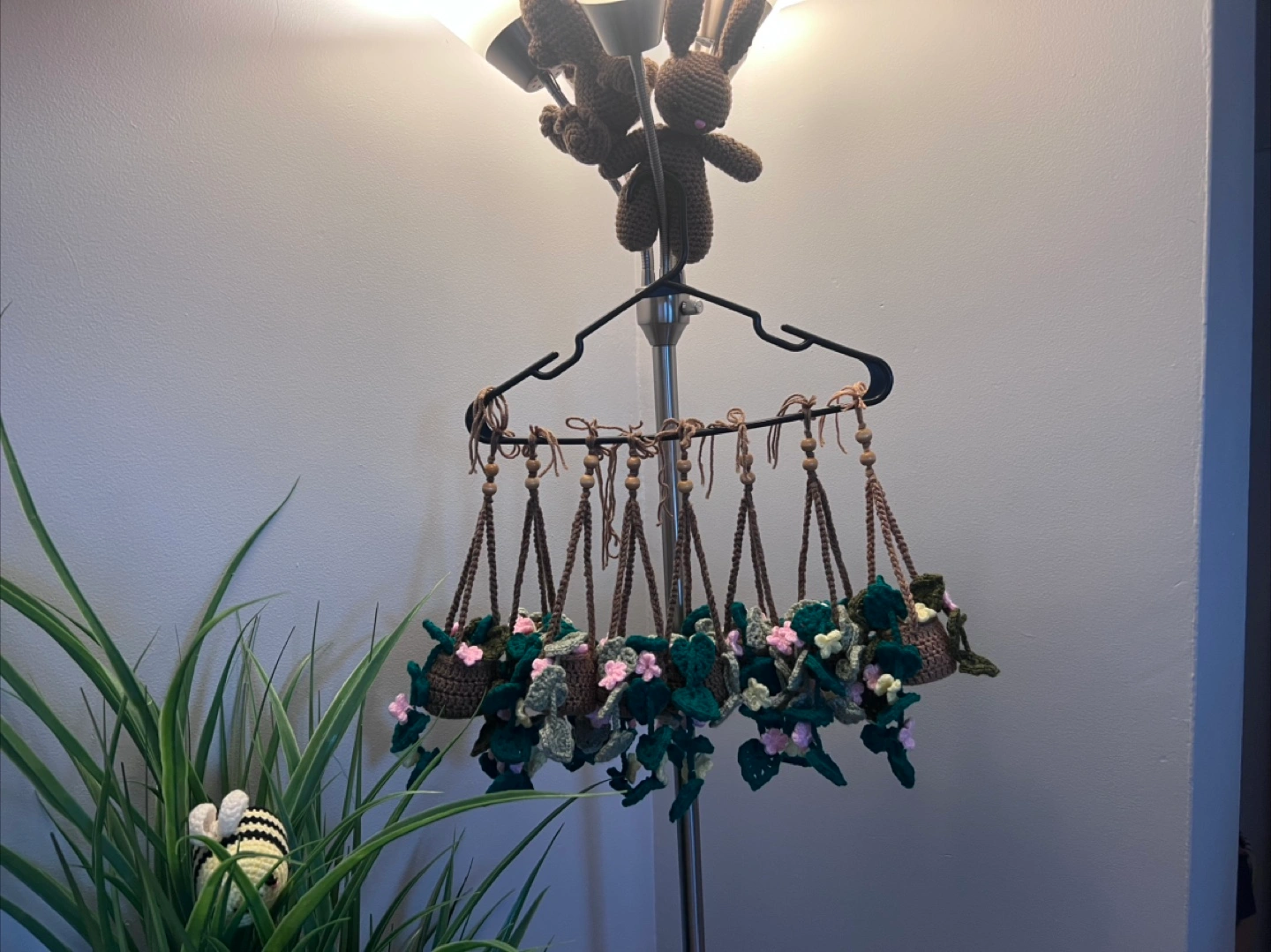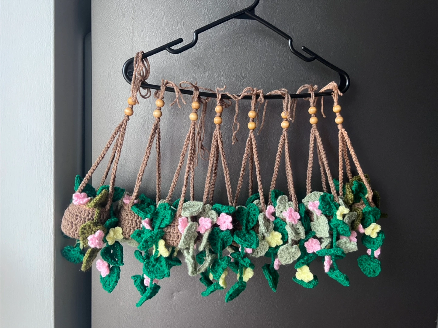I'm selling a set of handmade crochet flower basket . They have a cute, rustic look with wooden beads and little crocheted plants with pink flowers. Perfect for adding a touch of handmade charm to your home! Perfect gift for friends and kids …