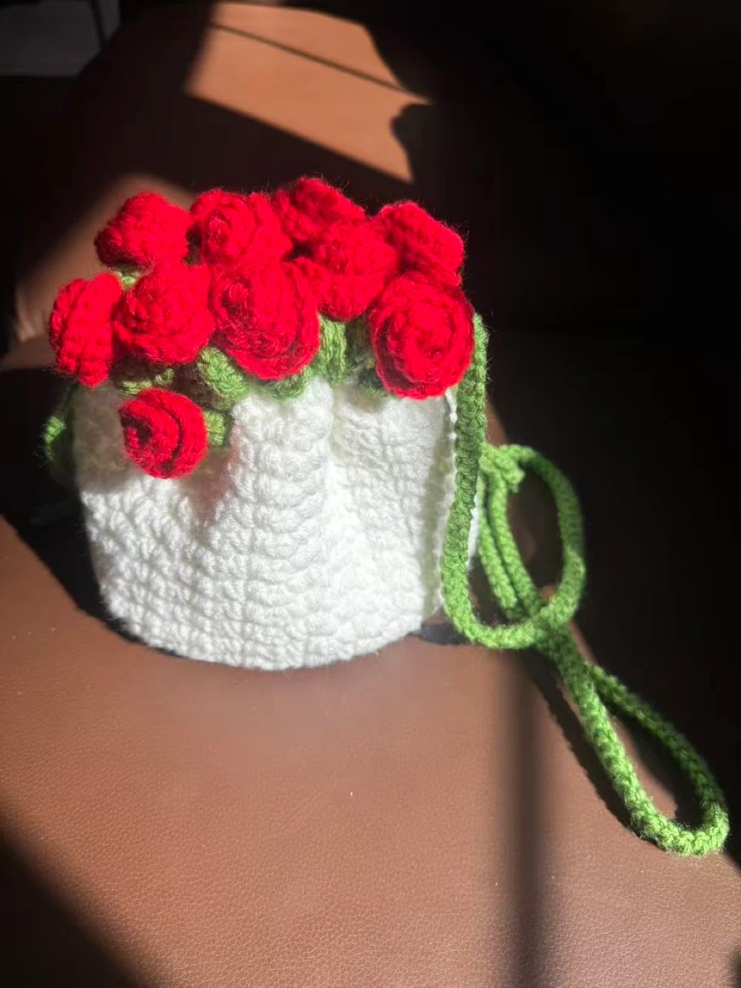 This is a handmade crochet bag featuring red roses on a white knitted base with a green strap. It's a unique and charming accessory, perfect for adding a touch of handmade artistry to your outfit!
