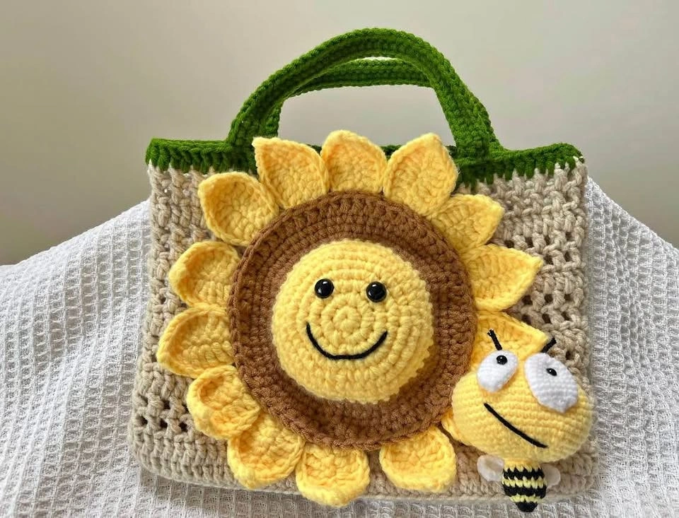 10Length: 28cm Width: 5-6cm Height: 21cm Handle: 10cm Price $65 is only for sunflower bag, bumblebee brooch is $10 with the bag, $30 without the bag. Pick up at Kensington Community Centre, or message for some other areas in Vancouver or Richmond. Cash only please.