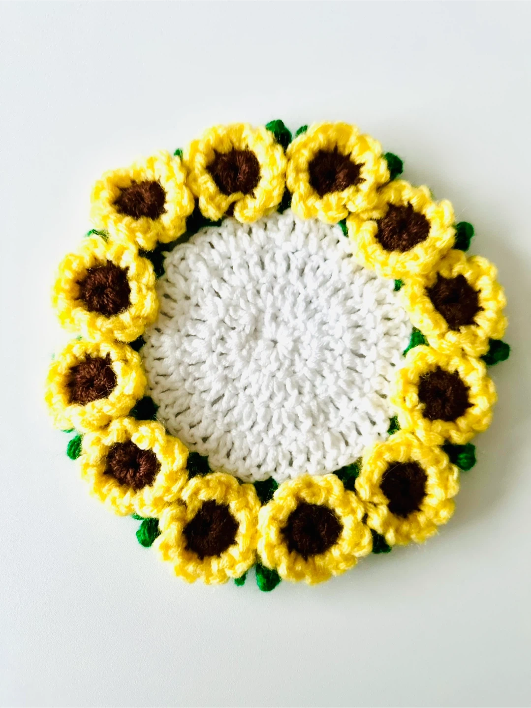 This is a handmade crochet coaster featuring a sunflower design. It's perfect for adding a touch of sunshine to your table! The coaster is made with yellow and brown sunflowers around a white center. It's in great condition and ready to brighten up your day