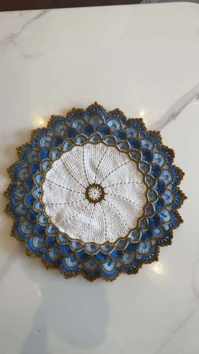 Selling a beautiful handmade crocheted doily. It features a lovely blue and white design with gold trim. Perfect for adding a touch of charm to your home decor!