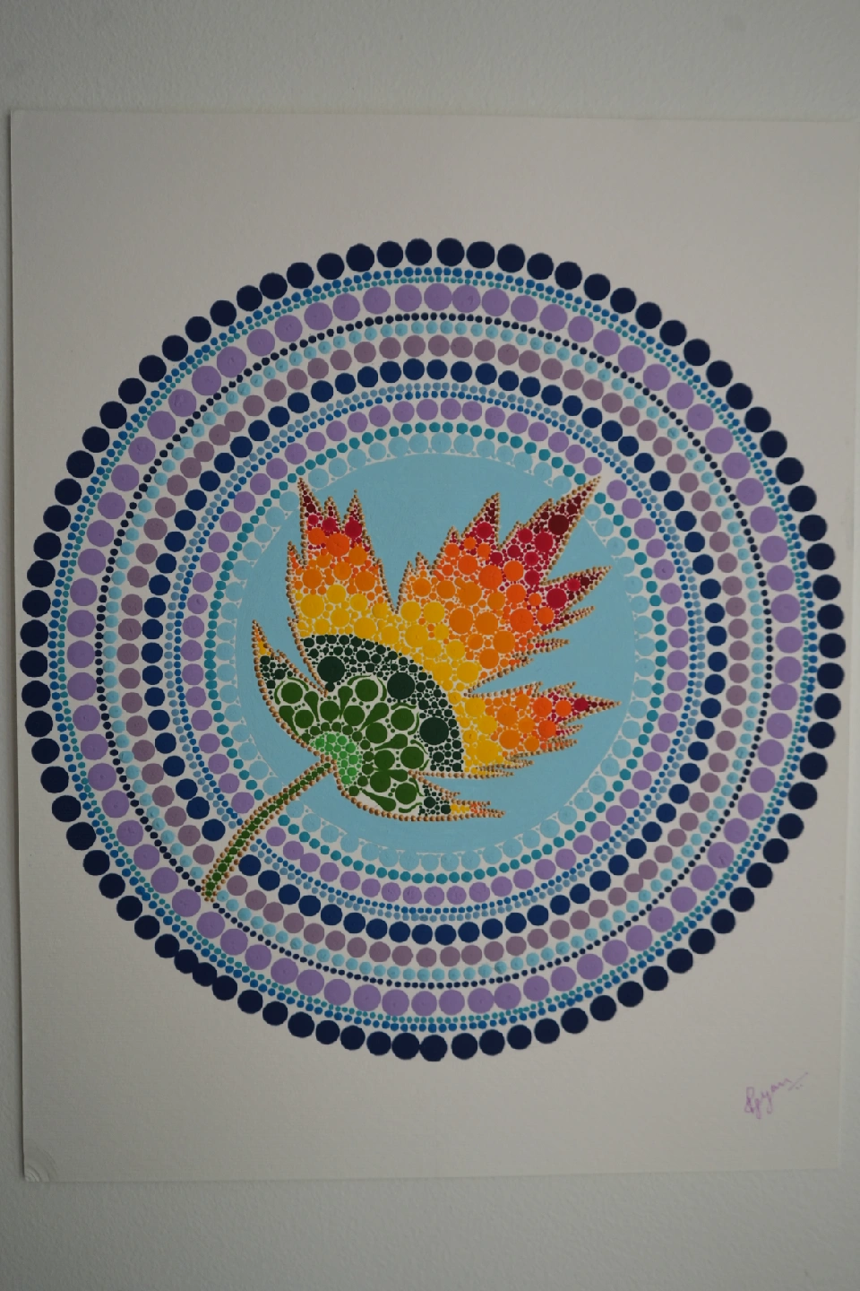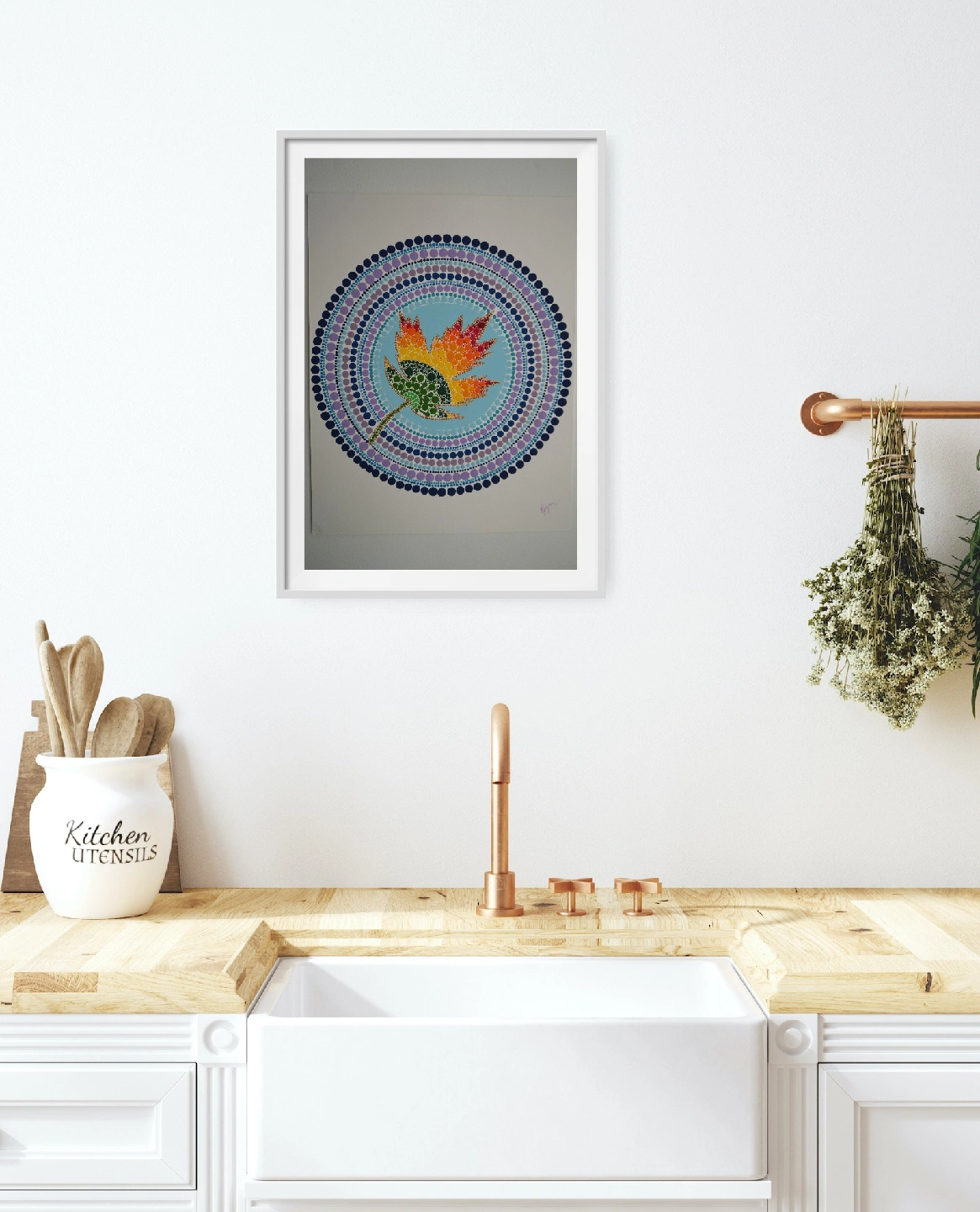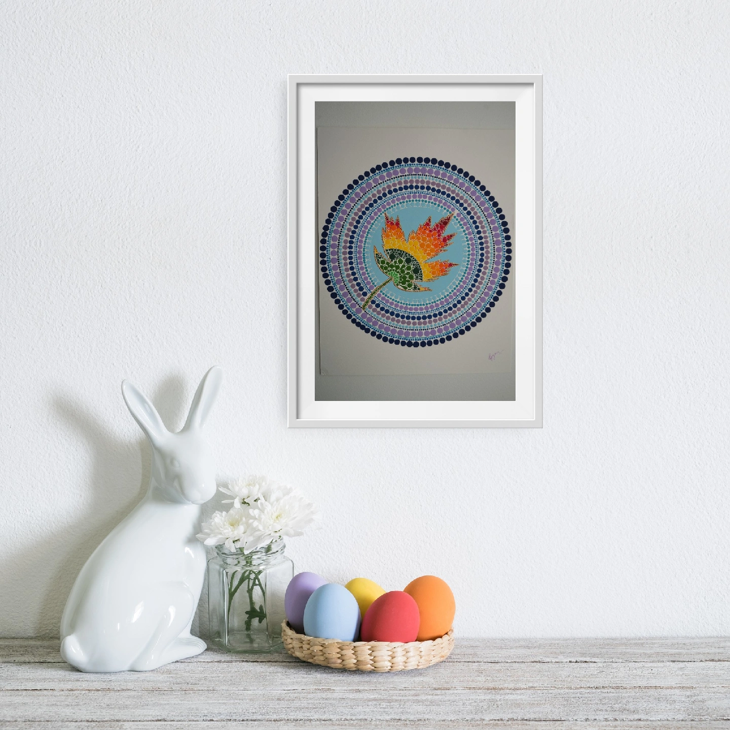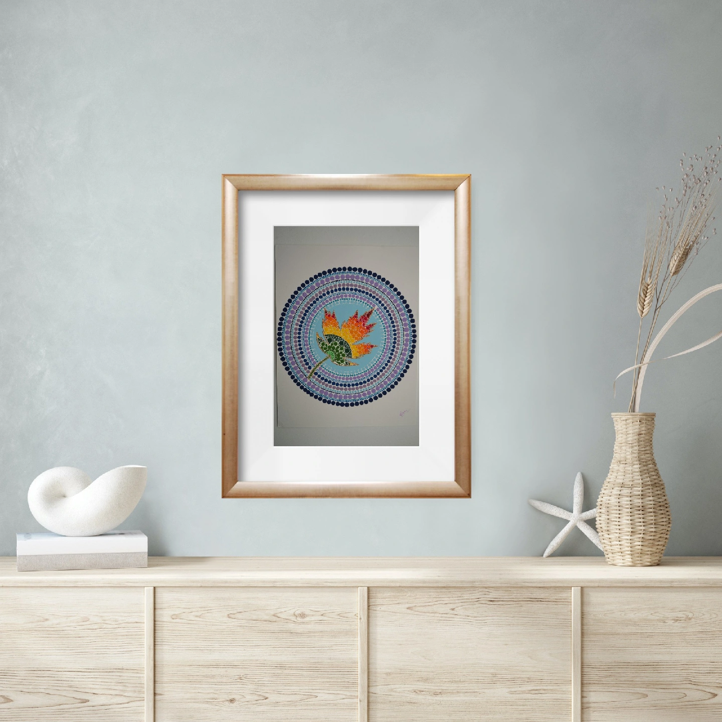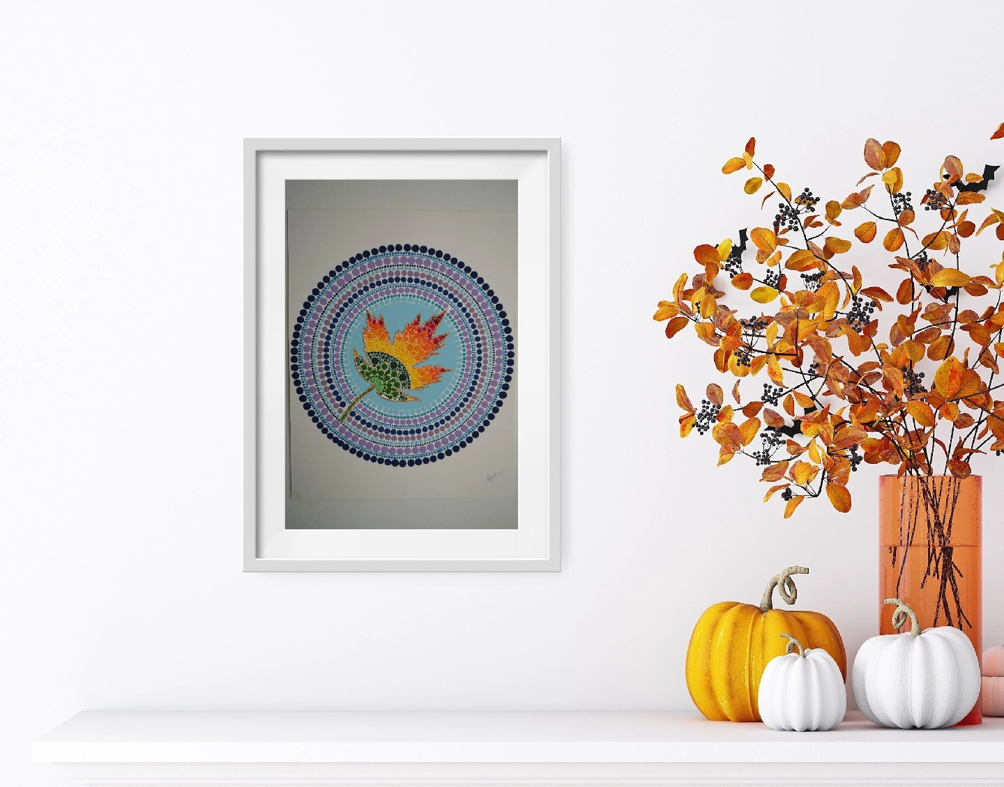 This is a beautiful dot art painting of a maple leaf. The colours are vibrant and the detail is amazing. It would look great in any home! please note that it is not framed.