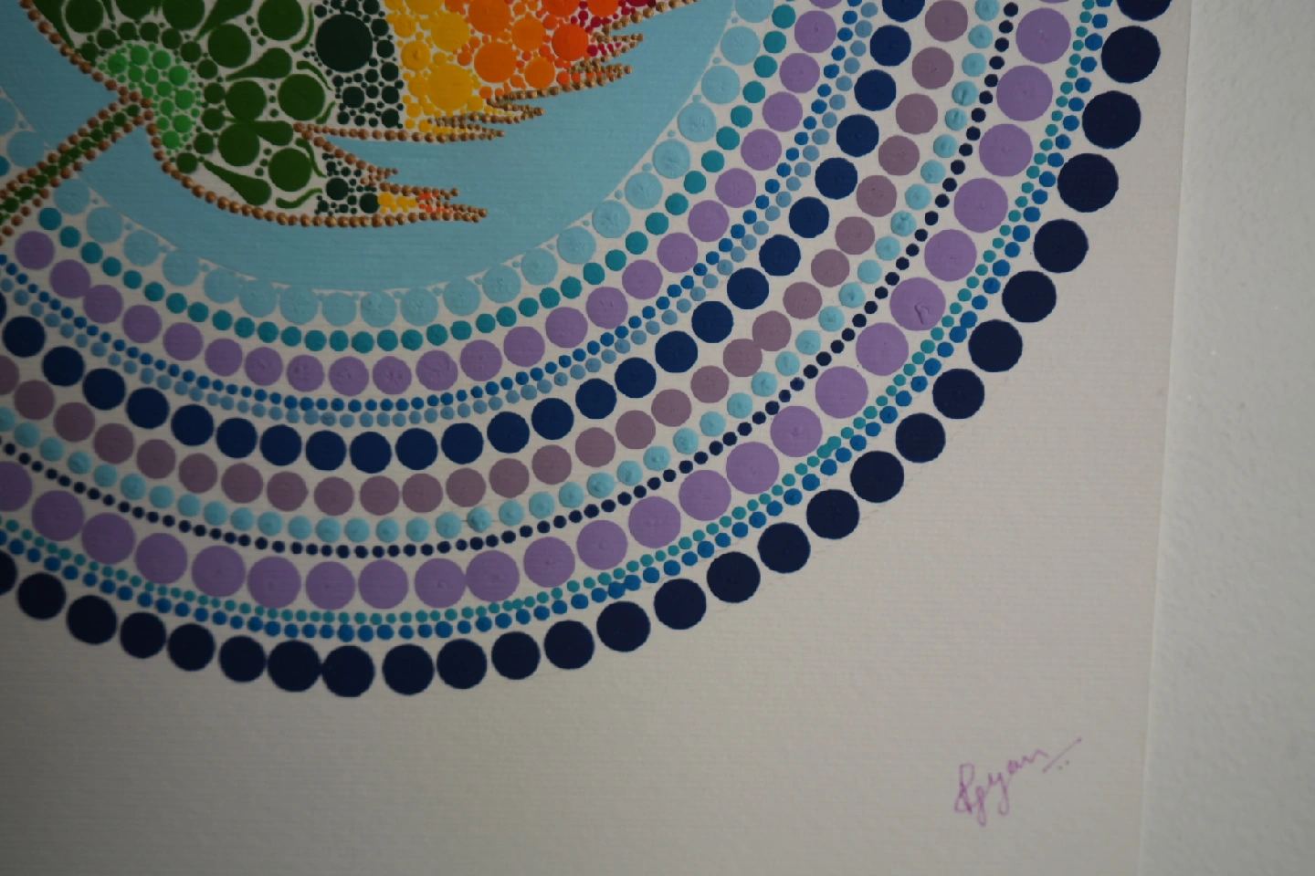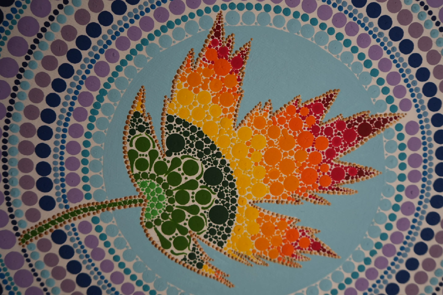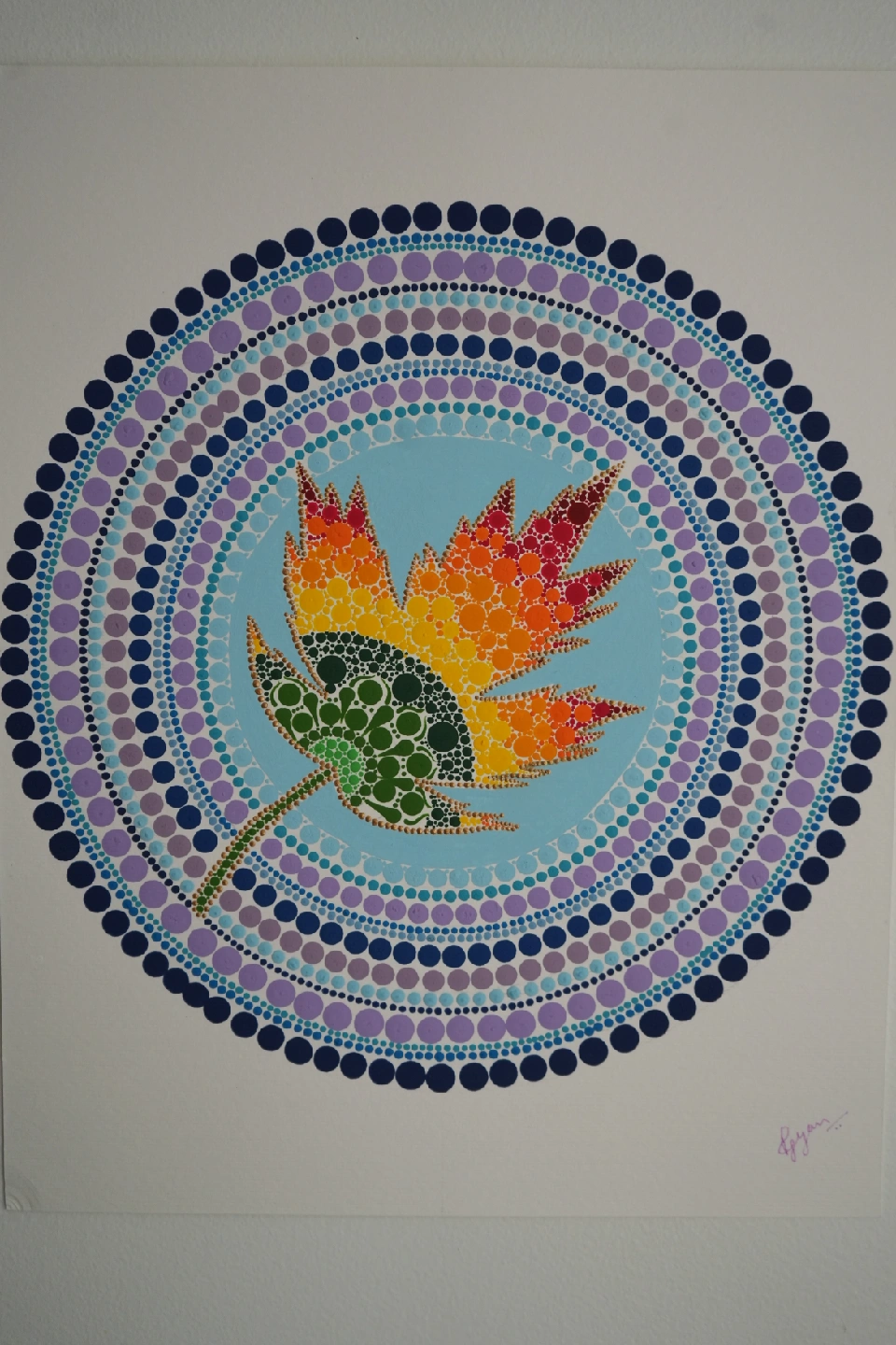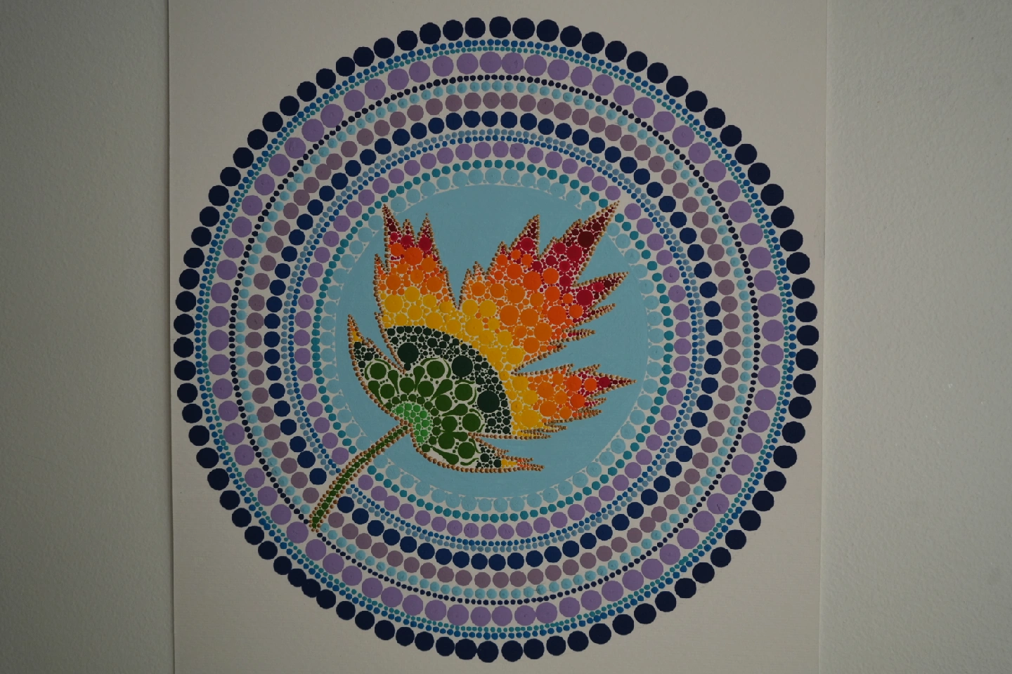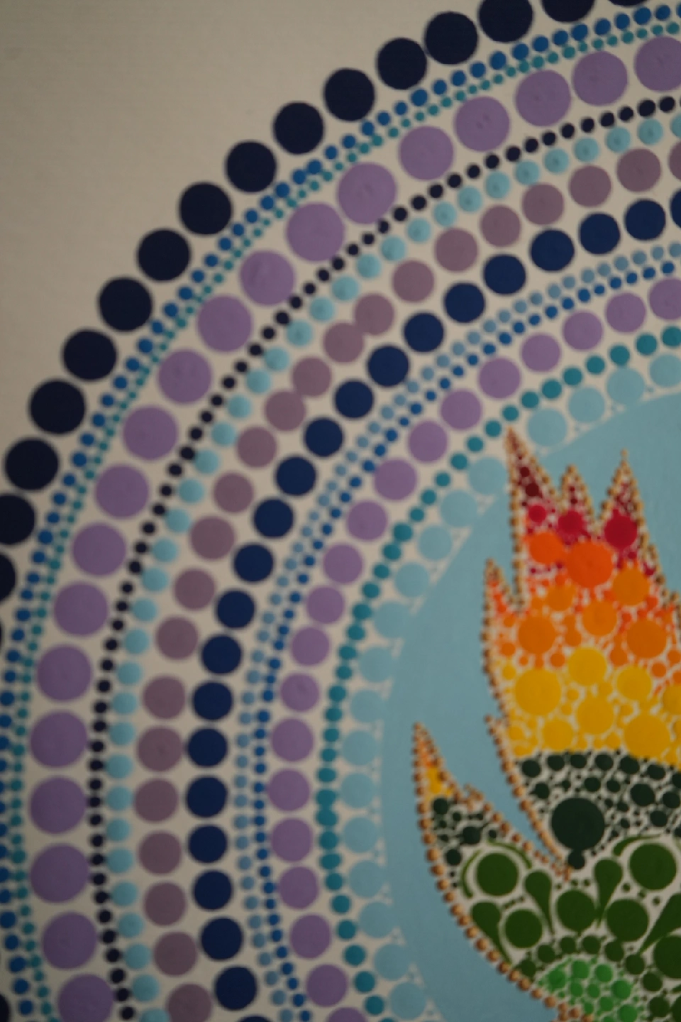 This is a beautiful dot art painting of a maple leaf. The colours are vibrant and the detail is amazing. It would look great in any home! please note that it is not framed.