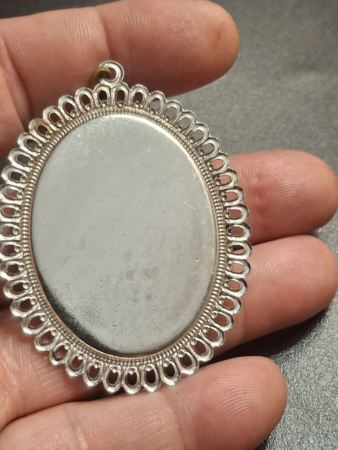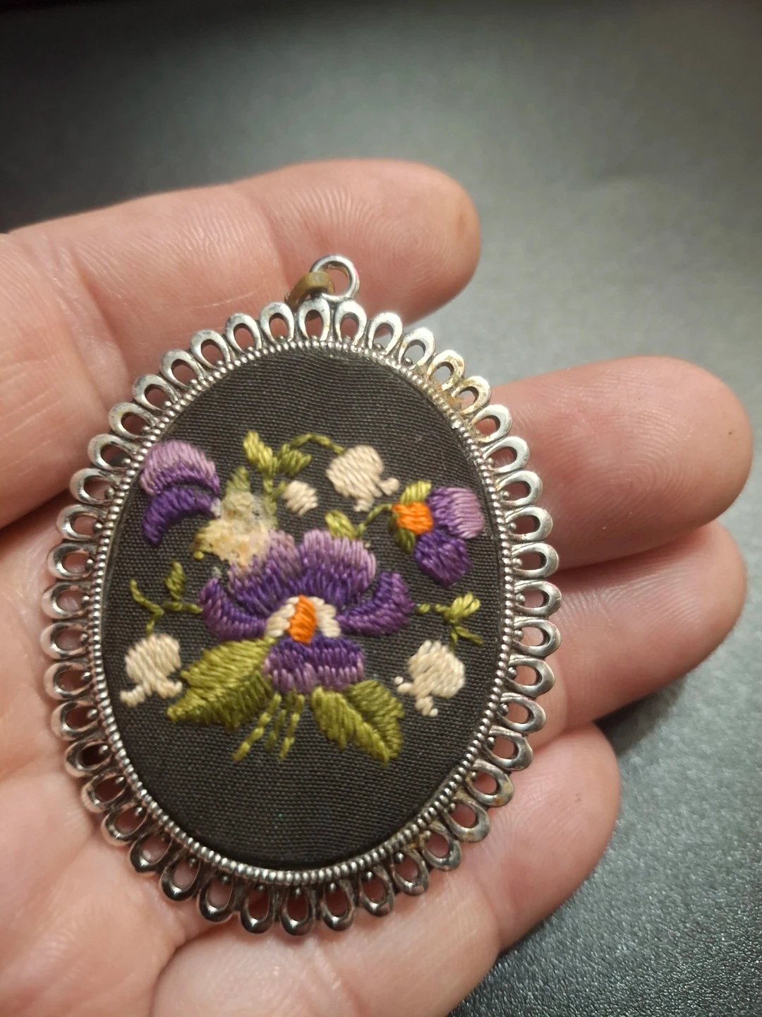 15Selling a lovely handmade pendant featuring embroidered floral design. The pendant has an oval shape with a silver-tone metal frame. It's in great condition and would make a beautiful addition to any outfit!
