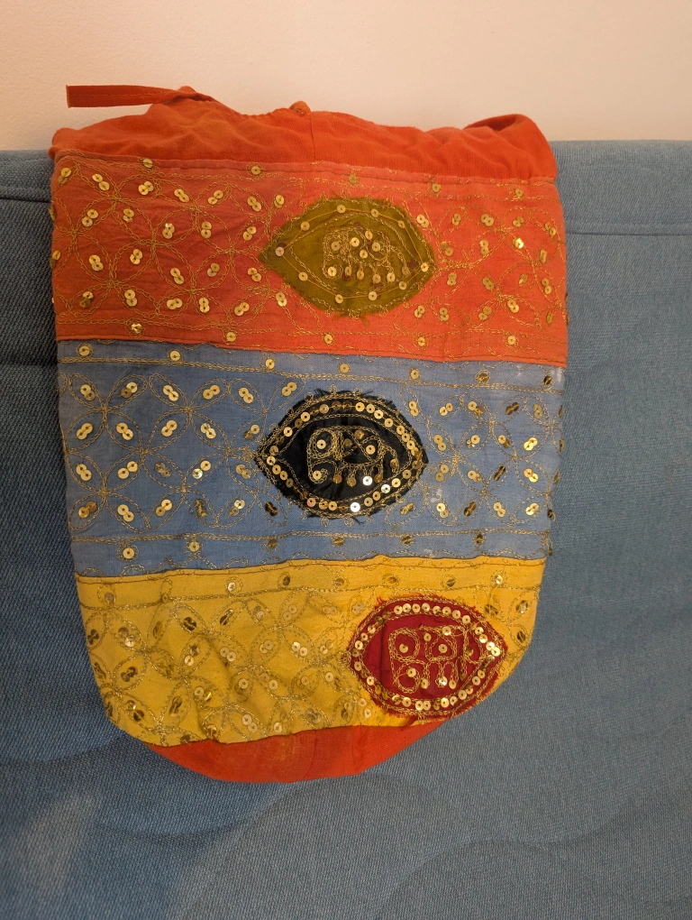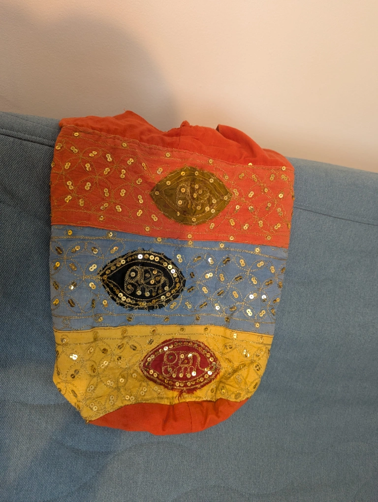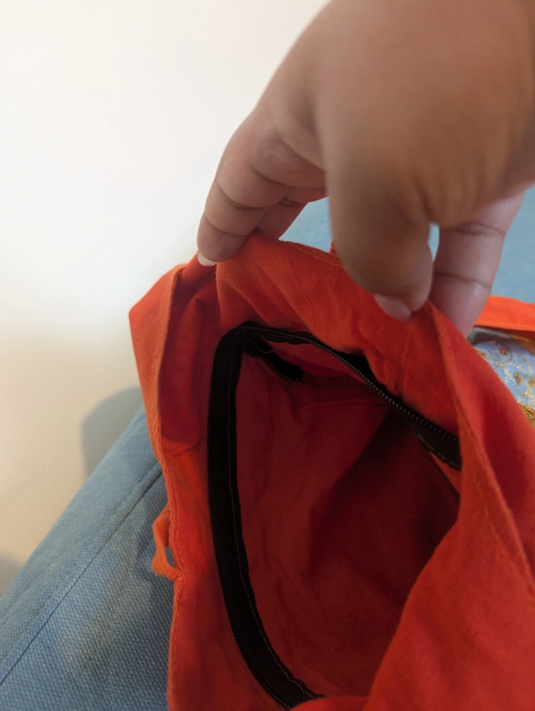 This is a unique handmade shoulder bag with beautiful embroidery and sequin details! It features a colourful design with orange, blue, and yellow sections. zipper doesn't work