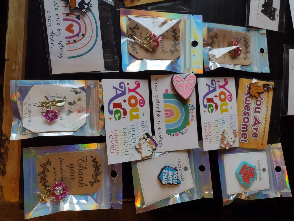 41Buy in bulk and l.will give you great deal.. Asking $ 1 each or if you buy in bulk , l will give you a deal.Selling a variety of handmade enamel pins! They come in different designs with cute and inspiring card and messages. Perfect for adding a little flair to your backpack, jacket, or pin collection. Great for Holiday Gift Baskets, Bags and even Party Favors. Would make great Stocking Stuffers.