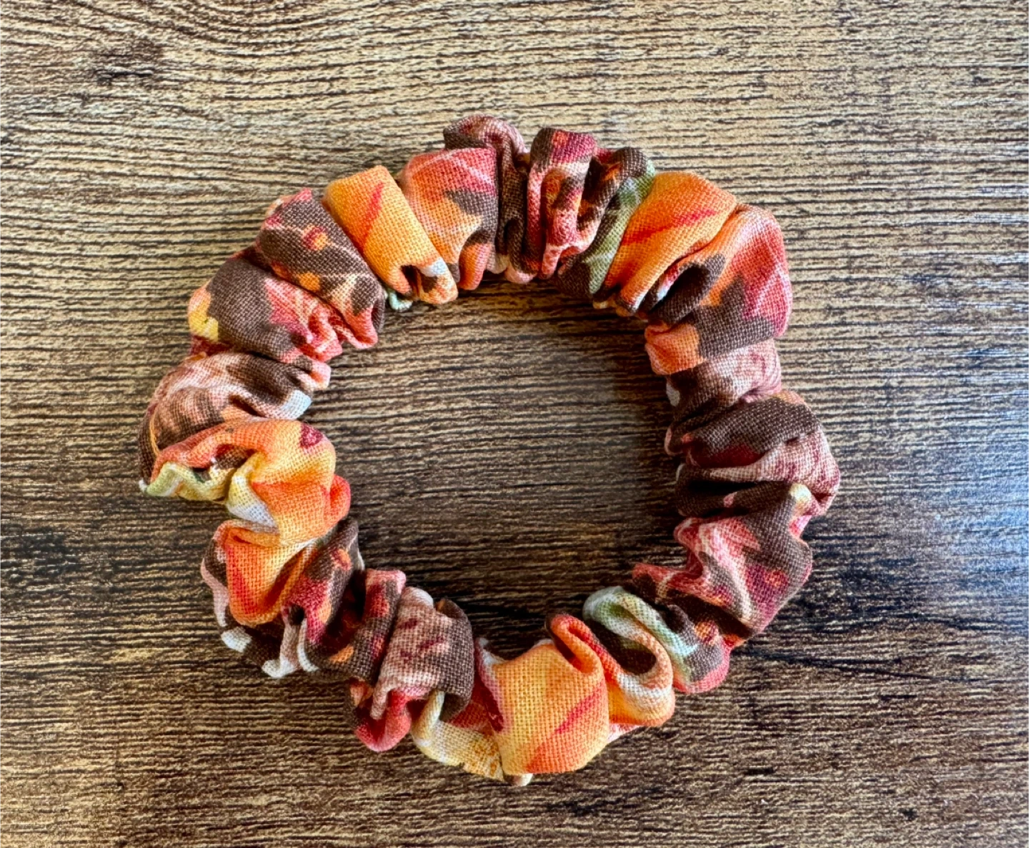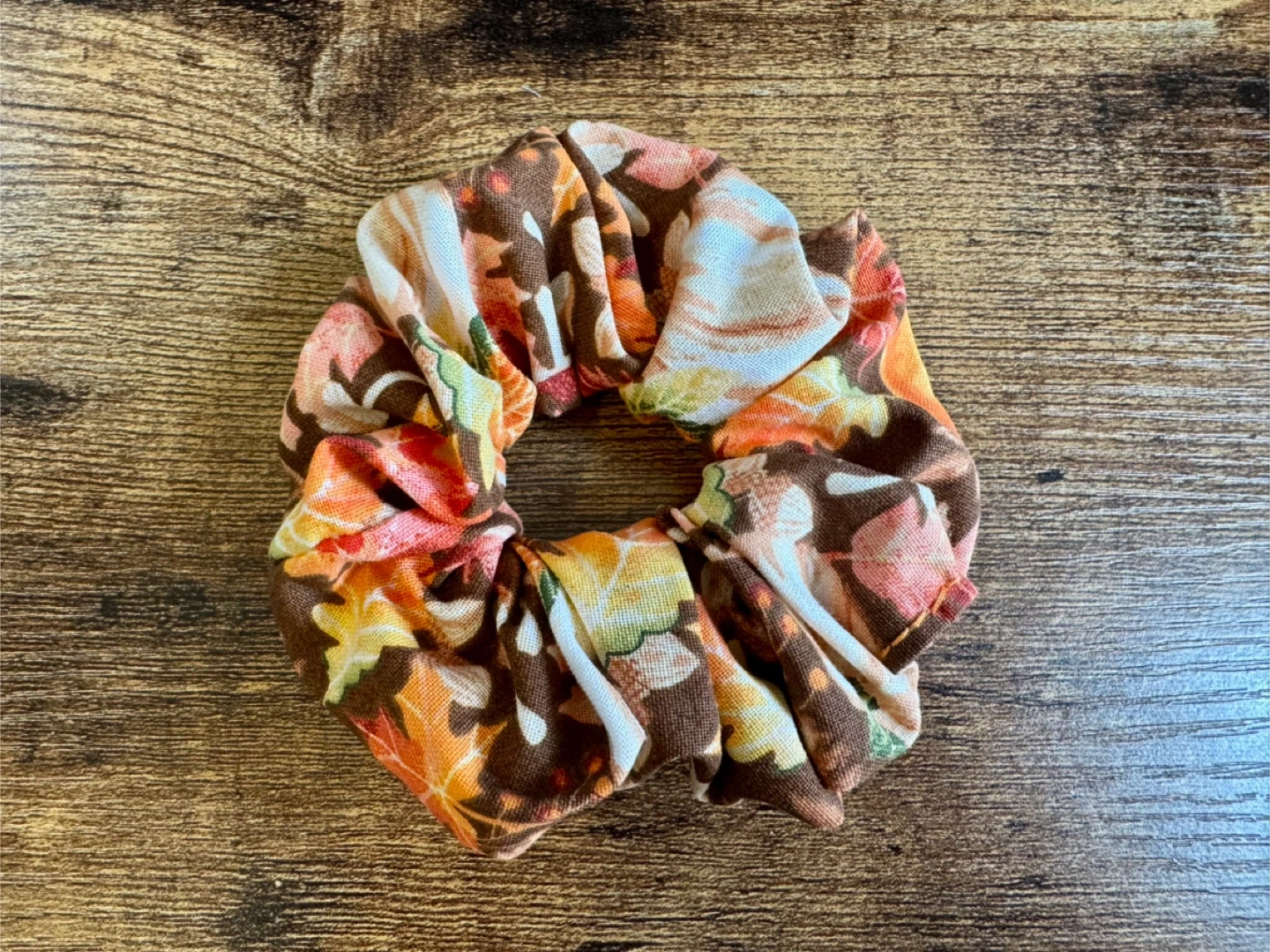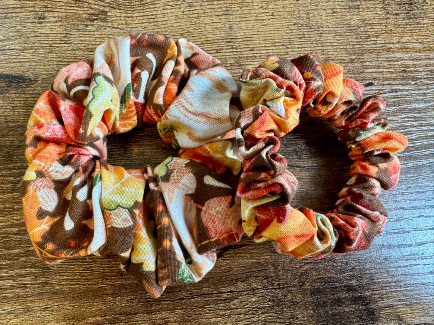I'm selling a set of two handmade scrunchies with a lovely fall-themed pattern. These scrunchies feature a mix of autumn colours like orange, brown, and yellow, perfect for adding ponytails to your hairstyle. They're in great condition and ready to be your new favourite hair accessory!