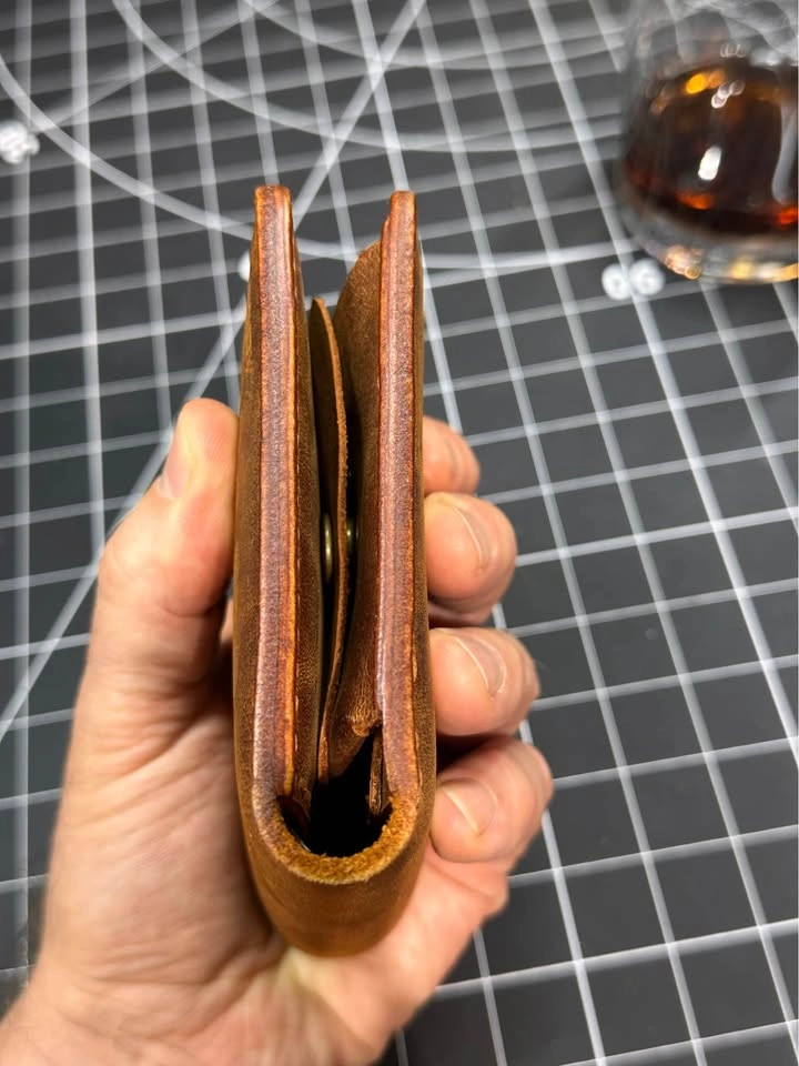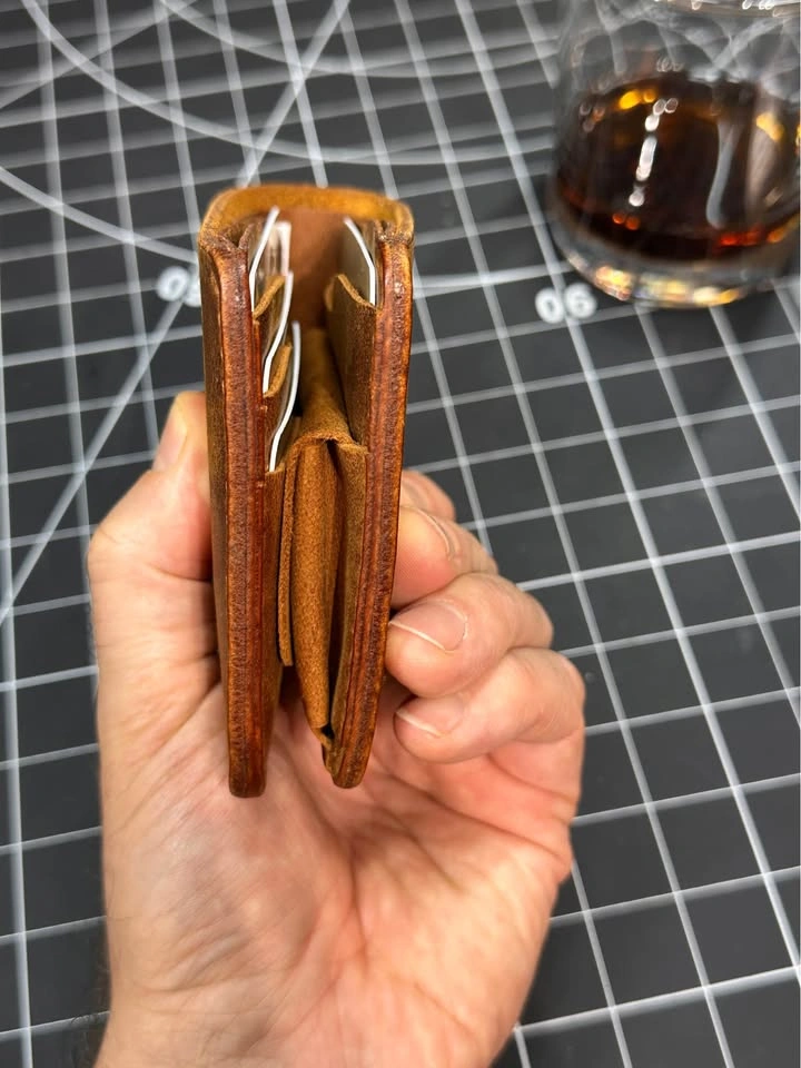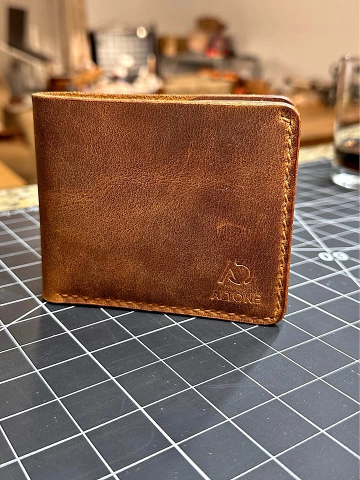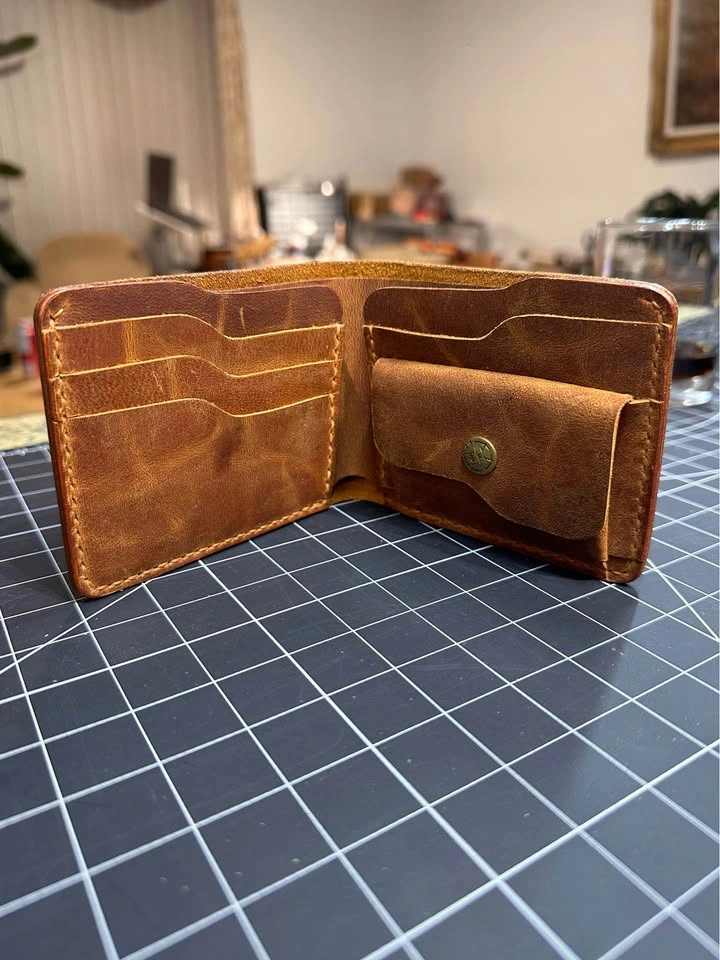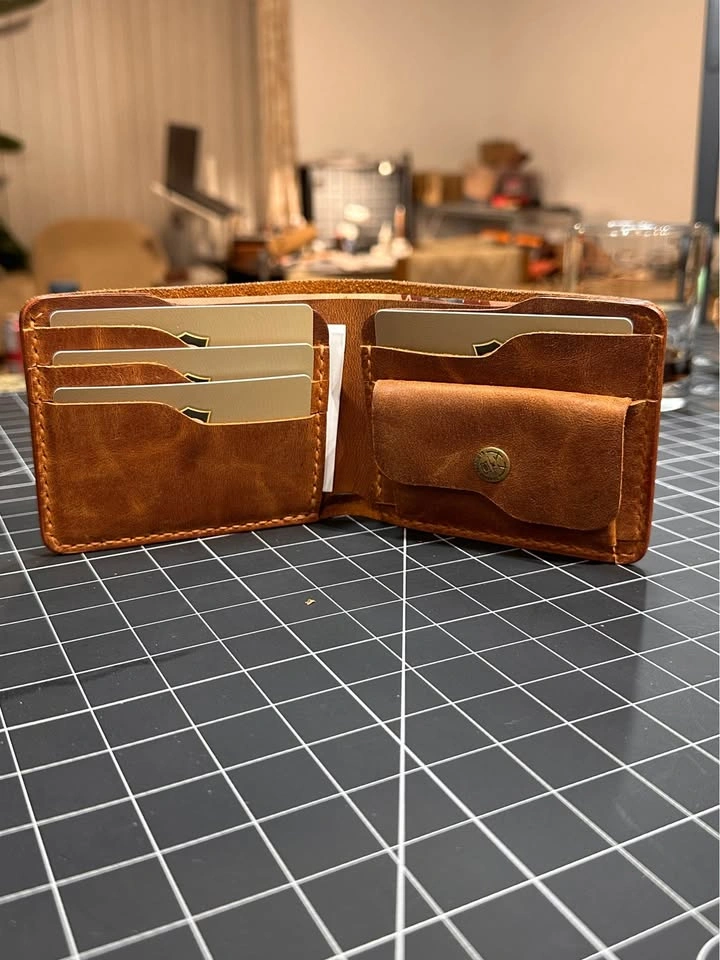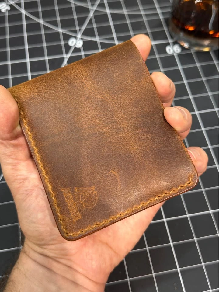 Crafted from premium full-grain leather, this bifold wallet combines timeless style with everyday practicality. The leather develops a rich patina with use, making each piece uniquely yours over time. Features • 4 card slots — comfortably fits debit/credit cards, IDs, and loyalty cards • Full-length cash pocket — holds bills flat without folding • Coin pocket with snap closure — secure space for coins, keys, or small items • 2 additional inner slots— perfect for receipts, tickets, or folded notes • Hand-stitched edges — durable waxed thread for long-lasting strength • Only Full Grain Leather — no additional materials, no fabrics or leather substitutes in hidden areas Why you’ll love it • Warm, natural pull-up texture that ages beautifully • Practical layout for daily use • Built with traditional leatherworking techniques — no machines, no shortcuts Ideal as a personal everyday wallet or a meaningful handmade gift.