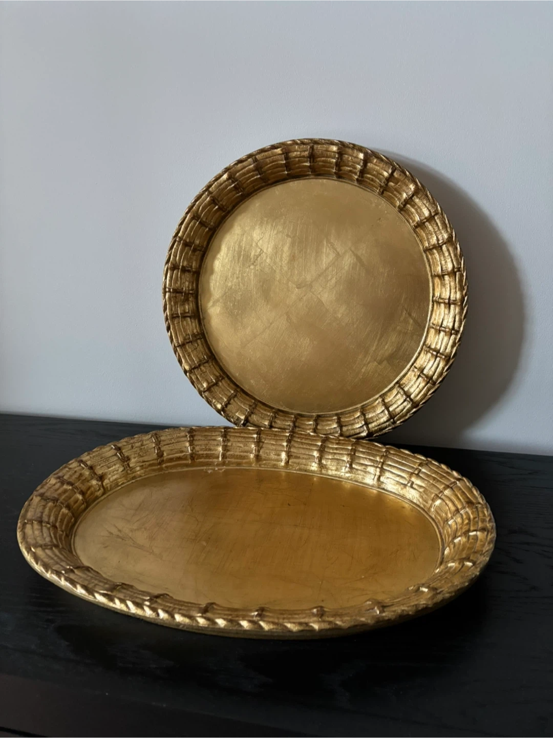 60Selling a set of two decorative trays in a beautiful gold finish! They're perfect for adding a touch of elegance to any room. One tray is round, and the other is oval. They're both in great condition and ready for a new home