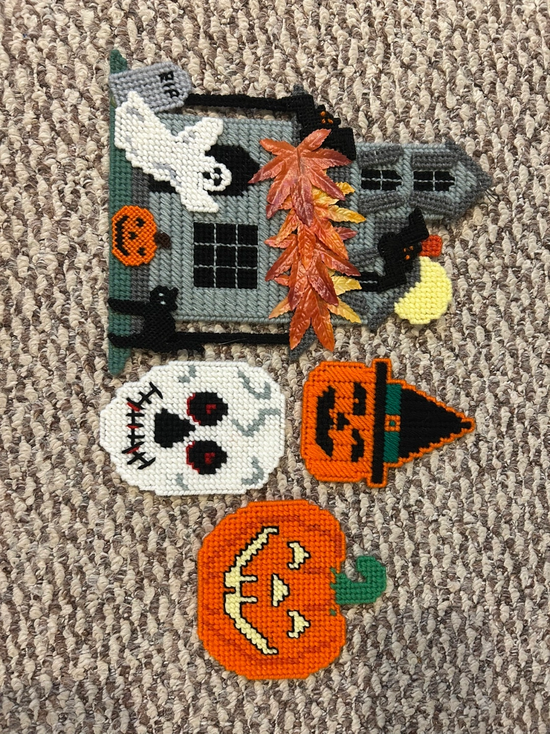 Selling a set of handmade Halloween decorations. These are crafted from yarn and perfect for adding a spooky touch to your home this season! Includes a haunted house, skull, and pumpkins