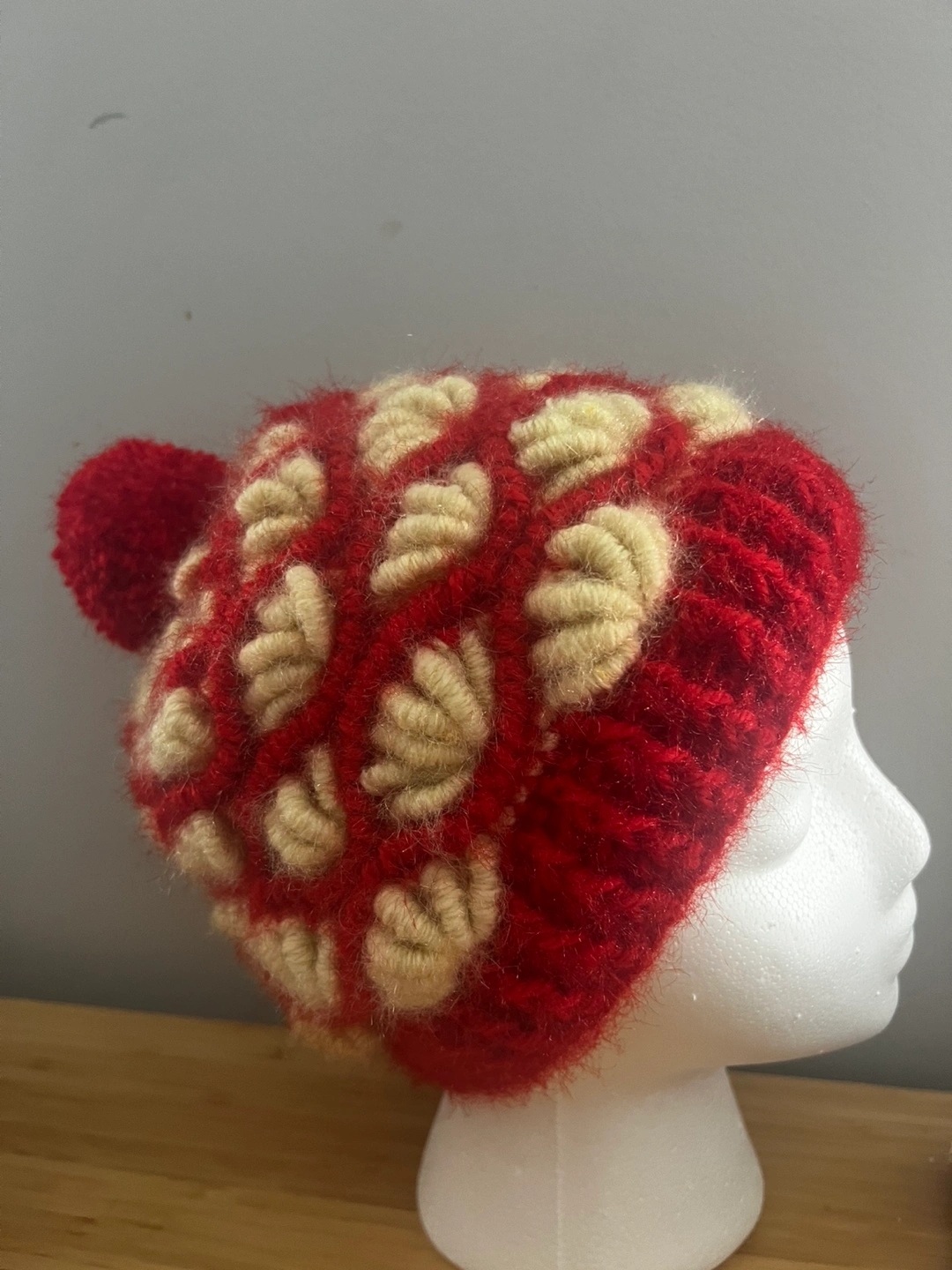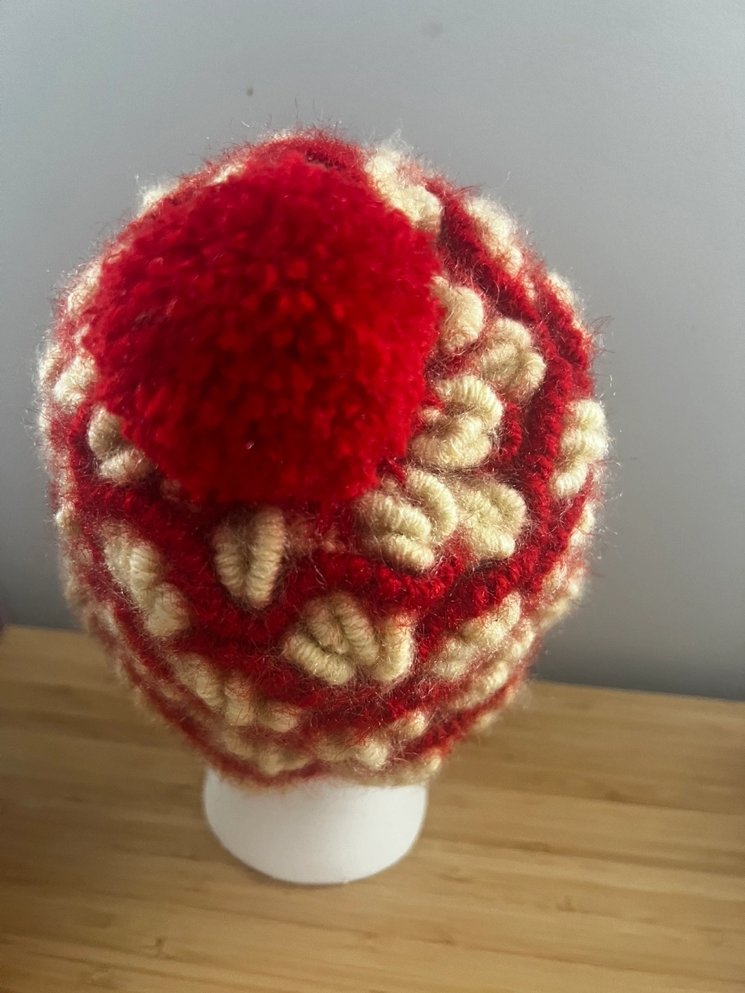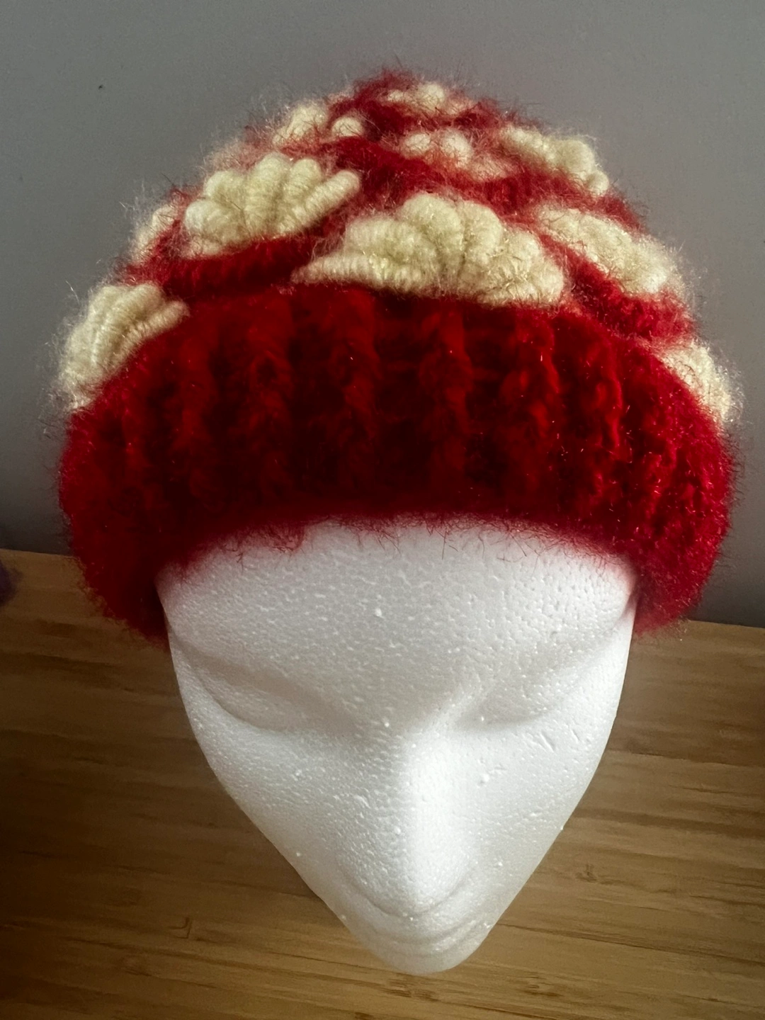 60Selling a handmade knitted toque! It features a lovely red and cream pattern. Perfect for keeping warm during the colder months!