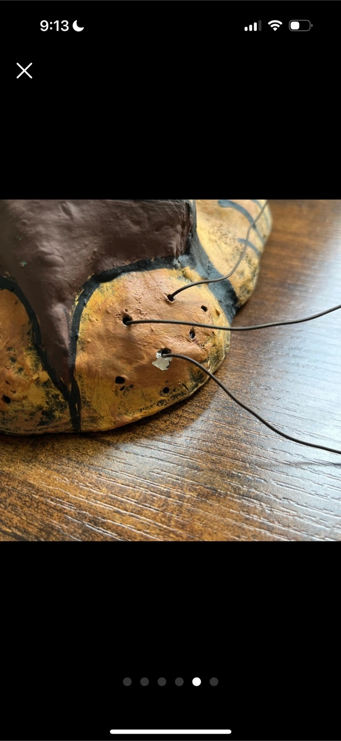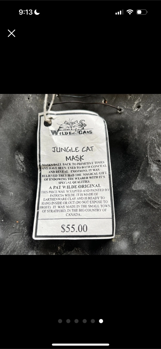 Hand-sculpted, hand/painted lion/cat mask wall art hanging with wire whiskers. New with tag, one small chip by one whisker (see photos). 11 inches top to bottom.