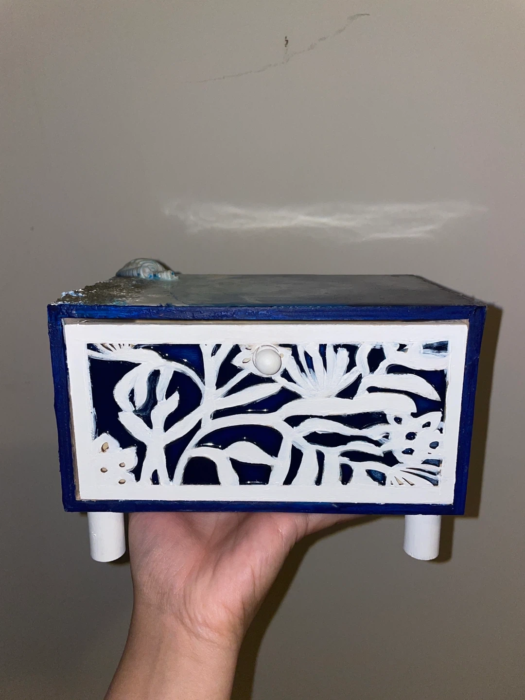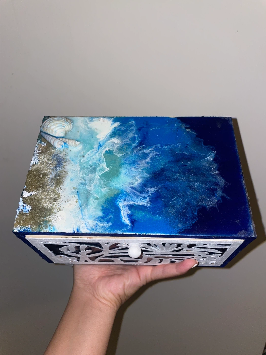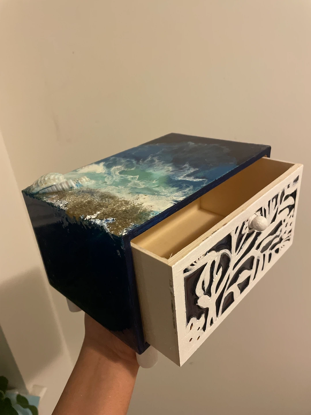 Selling a unique handmade decorative box featuring an ocean theme! It has a drawer with a white floral design and a knob. The top is decorated with resin, sand, and seashells, giving it a beautiful beachy vibe. The material is wood. It’s handmade.