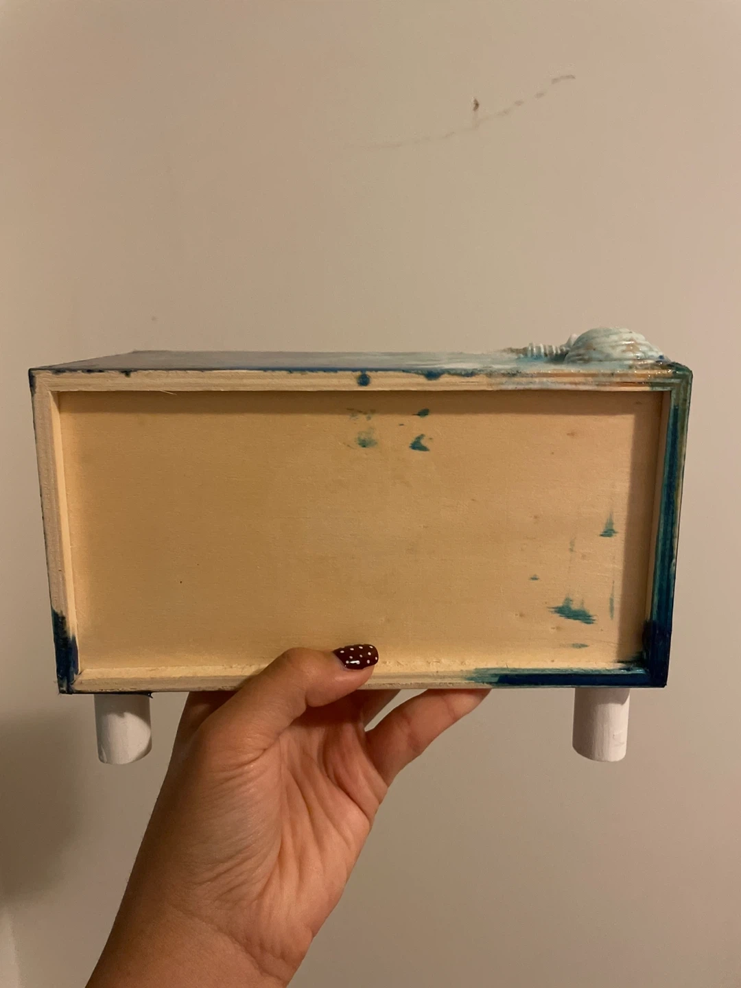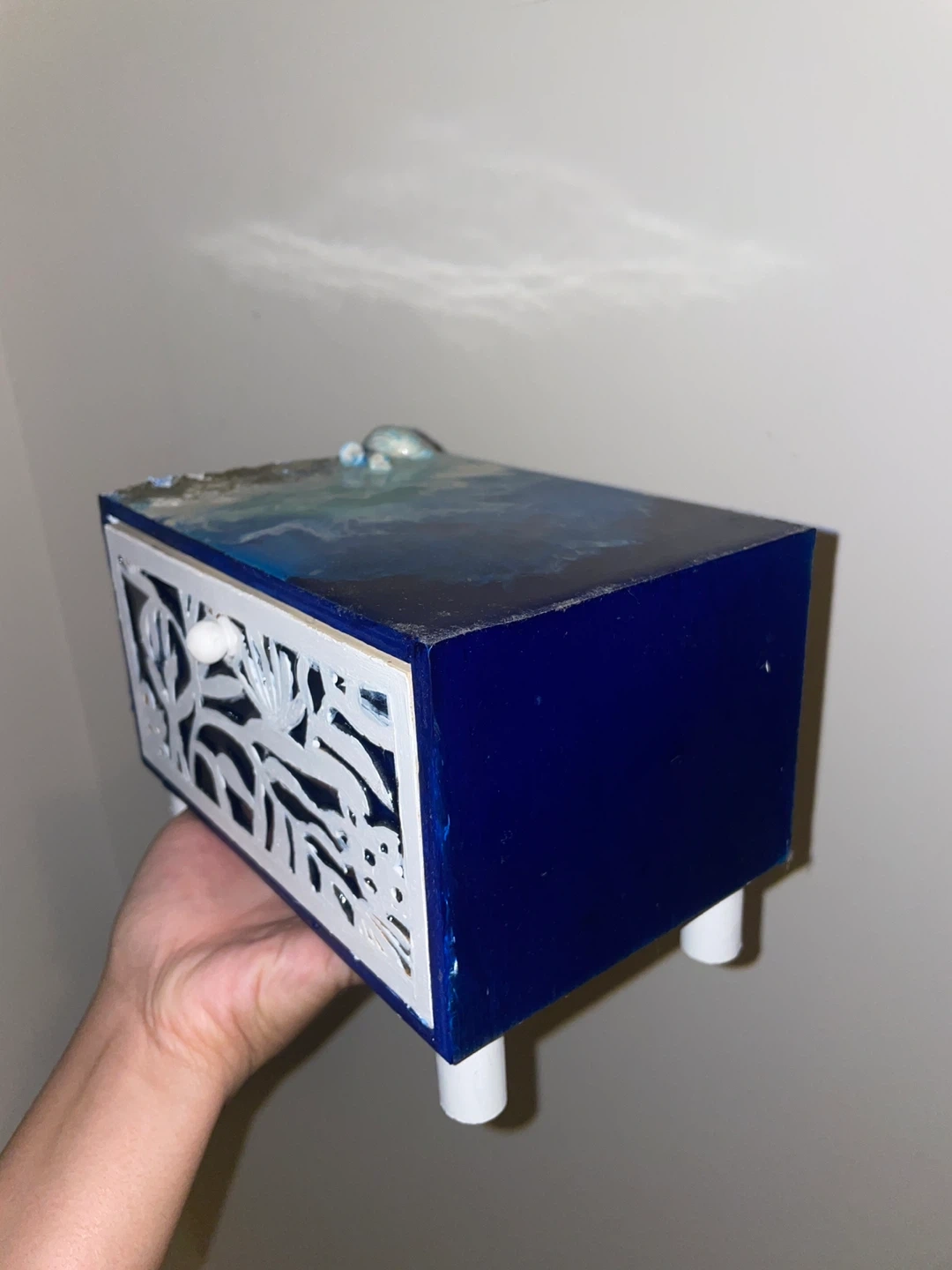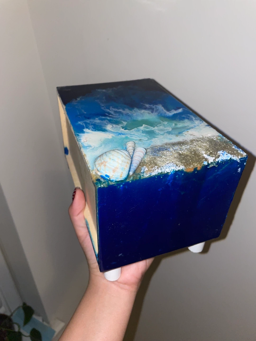 Selling a unique handmade decorative box featuring an ocean theme! It has a drawer with a white floral design and a knob. The top is decorated with resin, sand, and seashells, giving it a beautiful beachy vibe. The material is wood. It’s handmade.