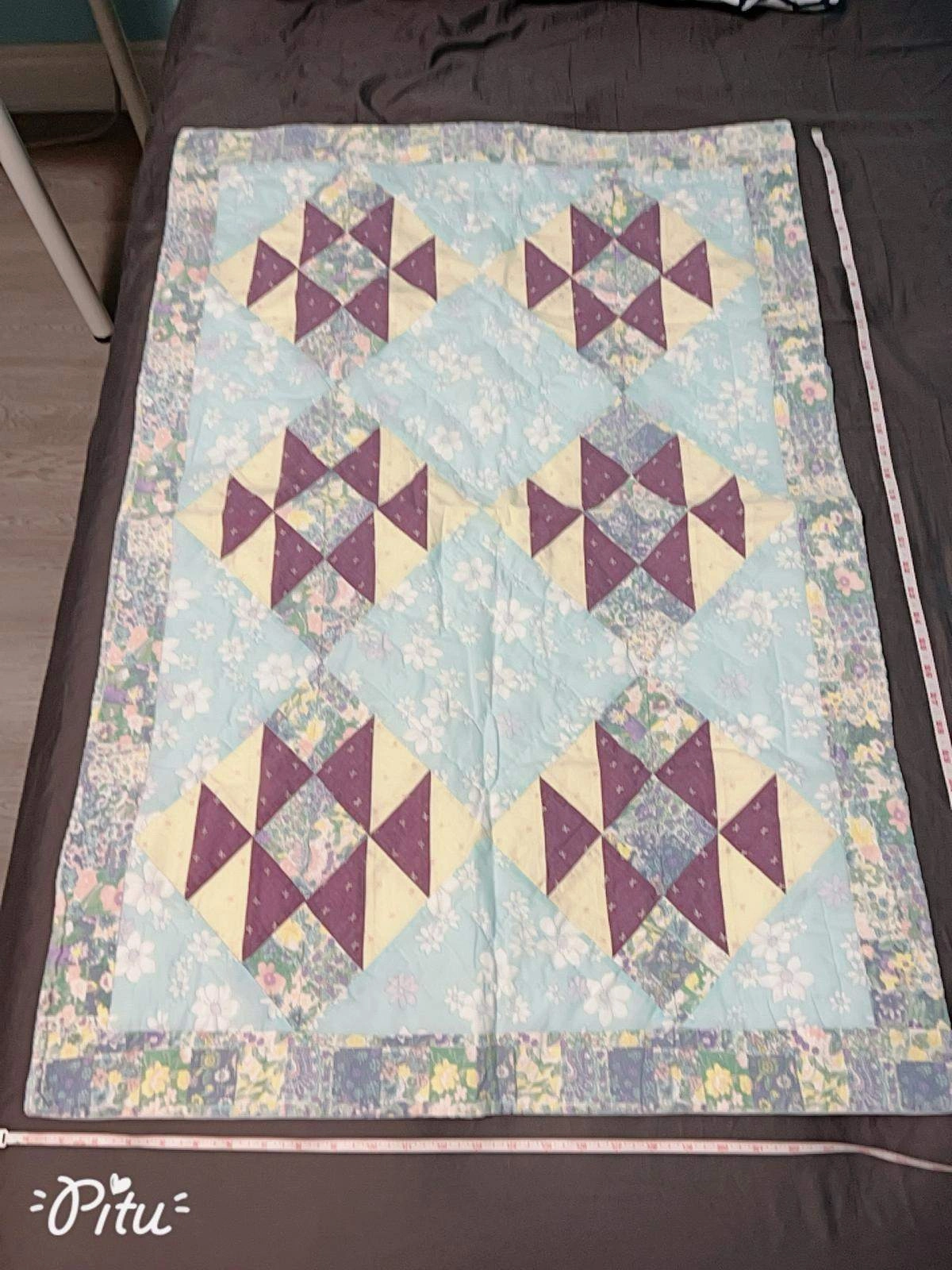 54Handmade patchwork quilt in soft Blue with purple diamond patterns and floral borders—charming, pieced-from-scraps coziness for bed or decor! 🛏️🧥