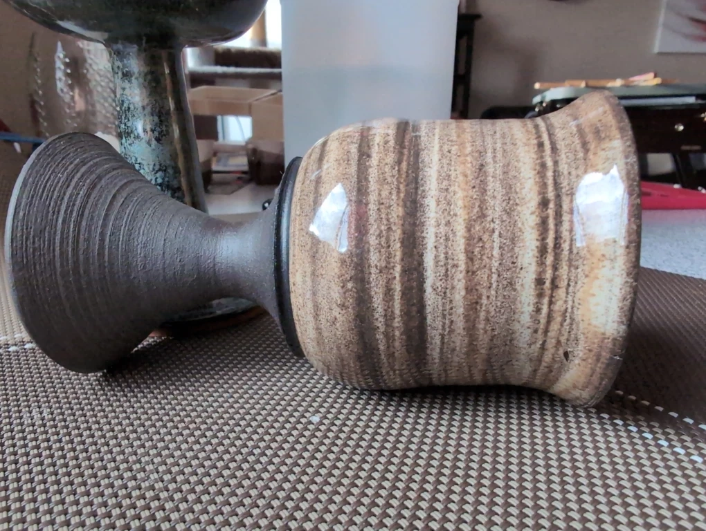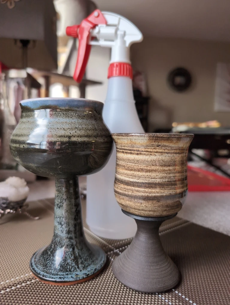 90Selling a set of two unique, handmade pottery goblets! Each goblet features a distinct design and colour palette. One is a sleek, dark green with a hint of blue (looks like it was made in Newfoundland ) while the other showcases warm, earthy brown tones. These goblets would make addition to any home! I believe they're handmade. 10$ for both Cash only pick up only
