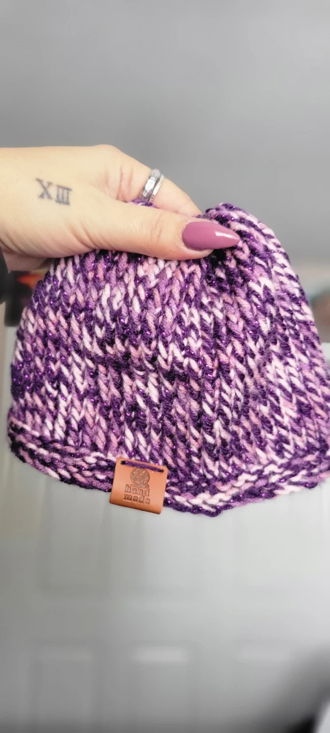 65Here's a cozy, handmade knit beanie in shades of purple and white! I have 2, one with a ponytail hole and one without l.