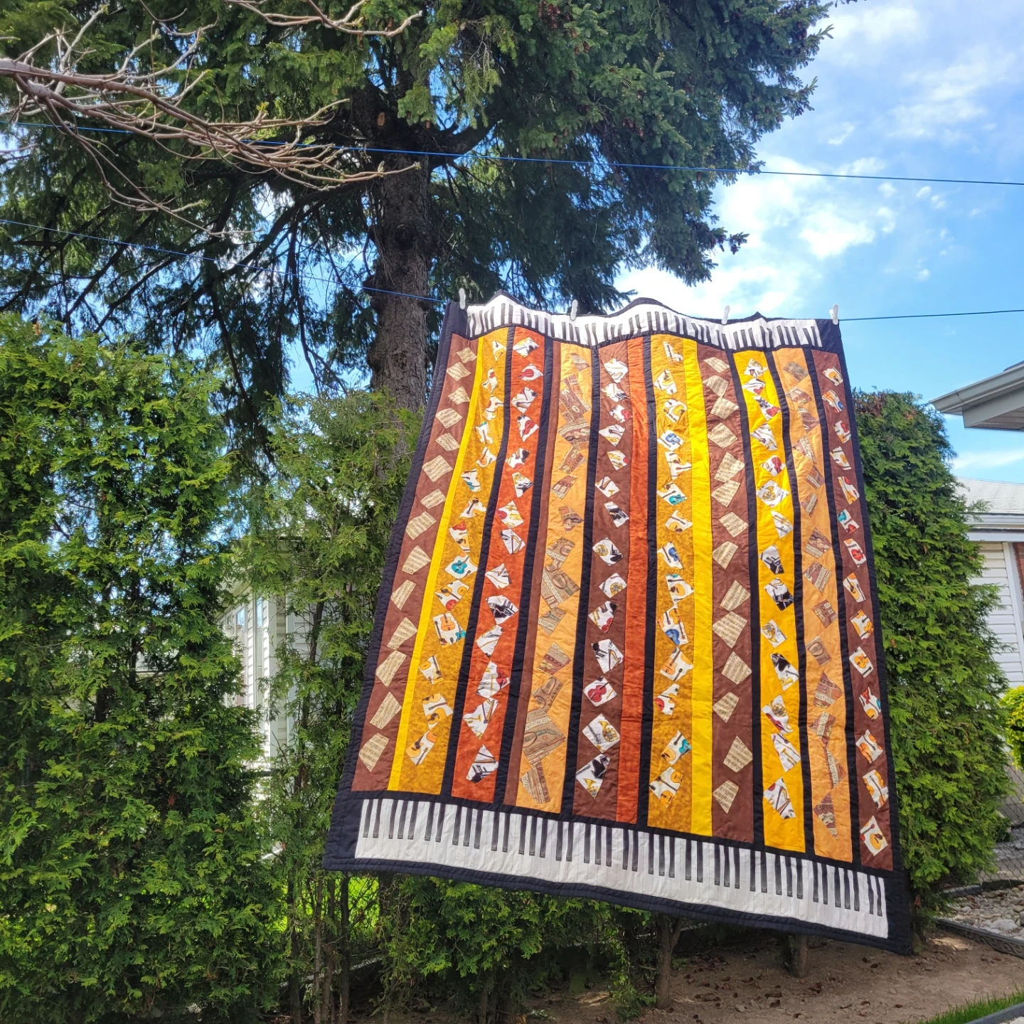 103This Piano Keyboards with Music Themed Quilt is Beautiful. 72" x 52" One side is Striped the other Music Themed Perfect Quilt or Picnic Blanket. $100 Firm Great Condition Pick up Fennell and Upper Gage area at my house. Please view my many listings for