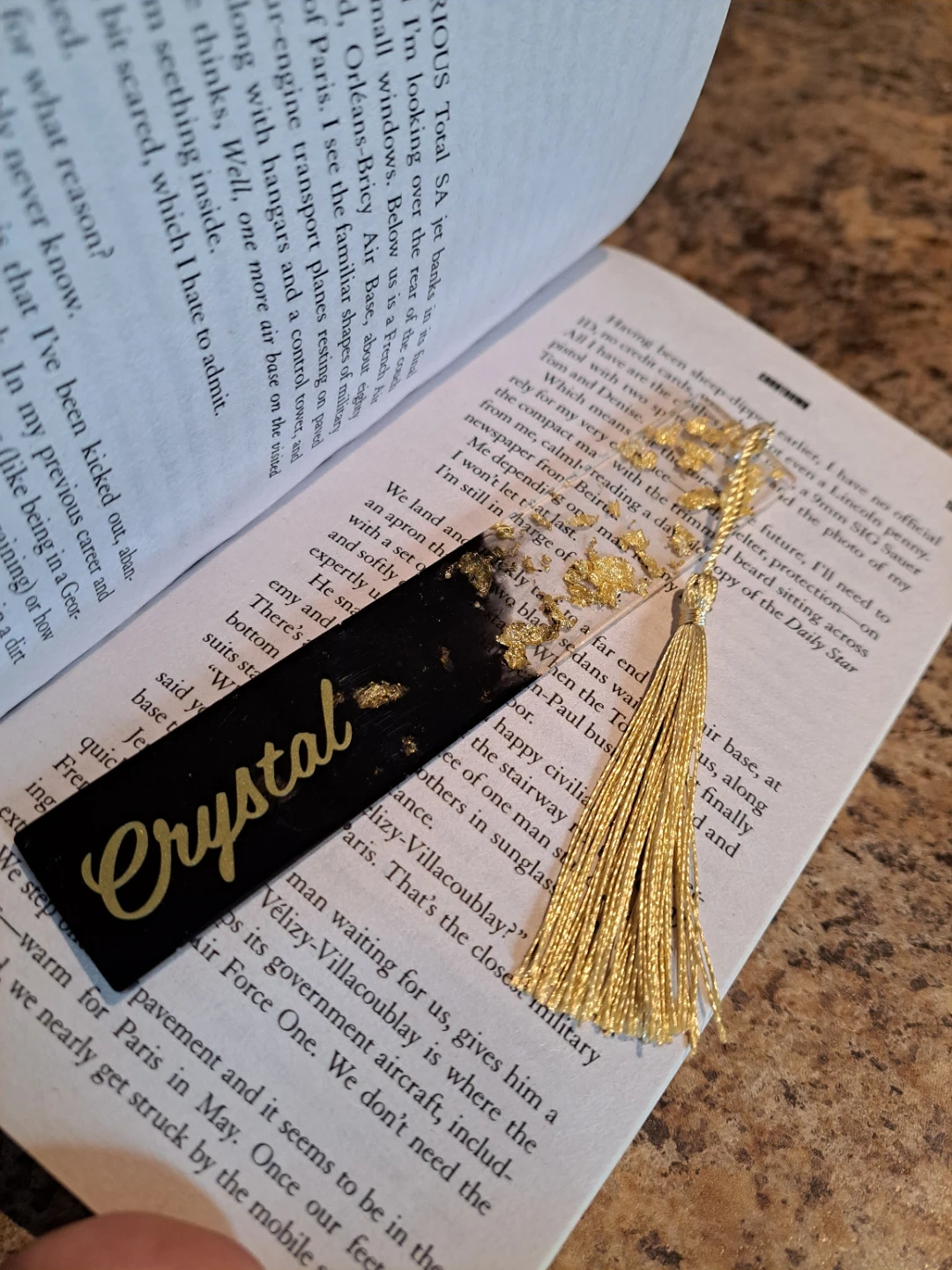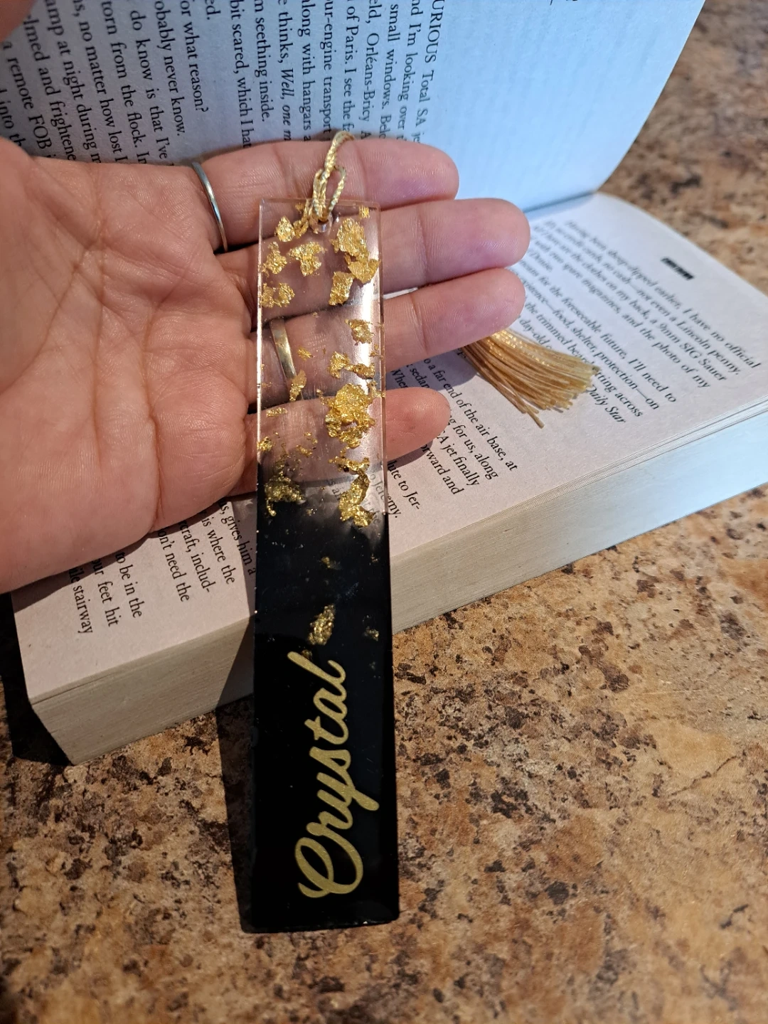 10Selling handmade personalozed resin bookmarks! They are a black and clear design with gold leaf flakes and a gold tassel. The name is written in gold lettering on the black part of the bookmark! Perfect stocking stuffer idea for any book lover!