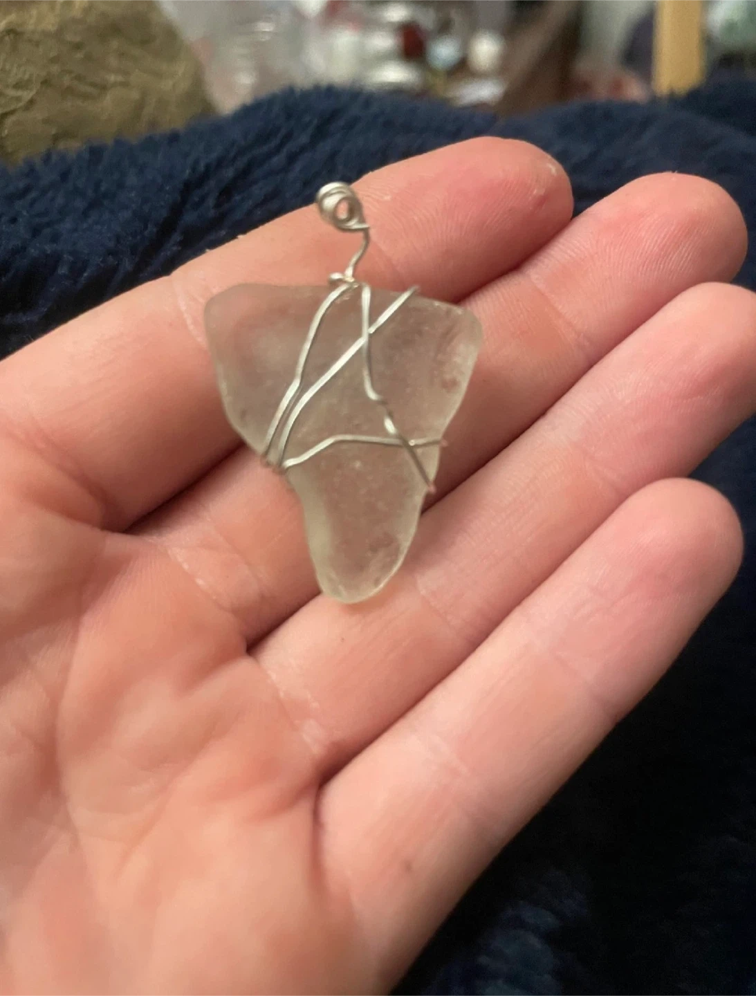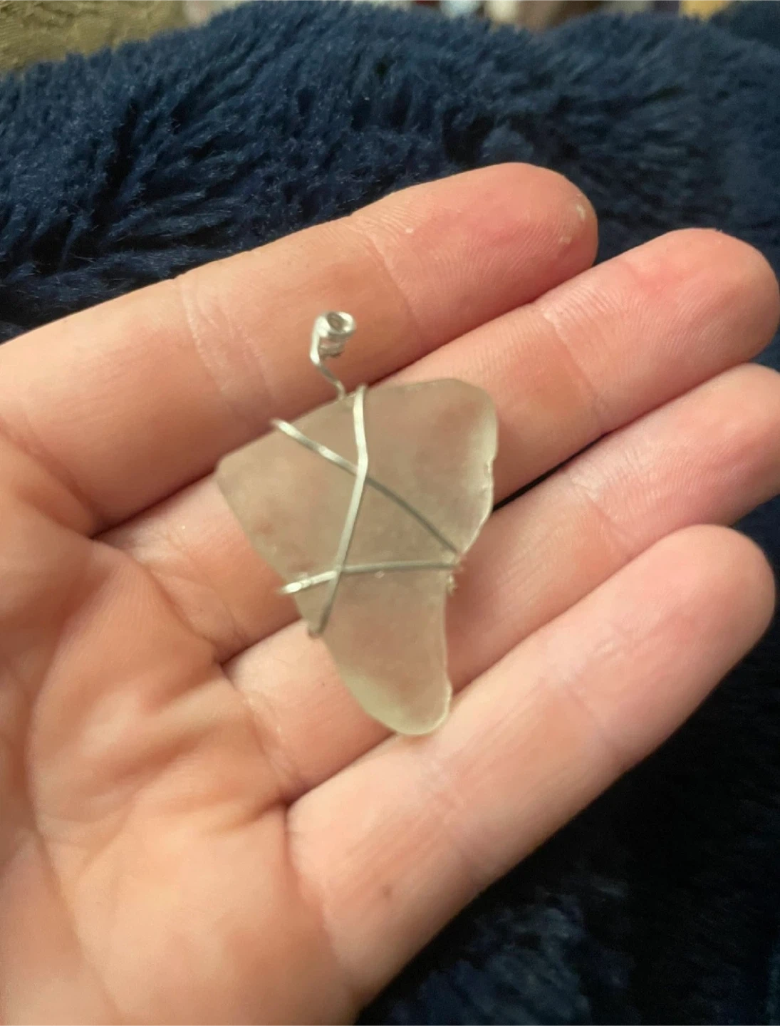 30Selling a handmade sea glass pendant . The sea glass is a light, frosted colour and is wrapped with silver wire. Perfect for a beach lover!