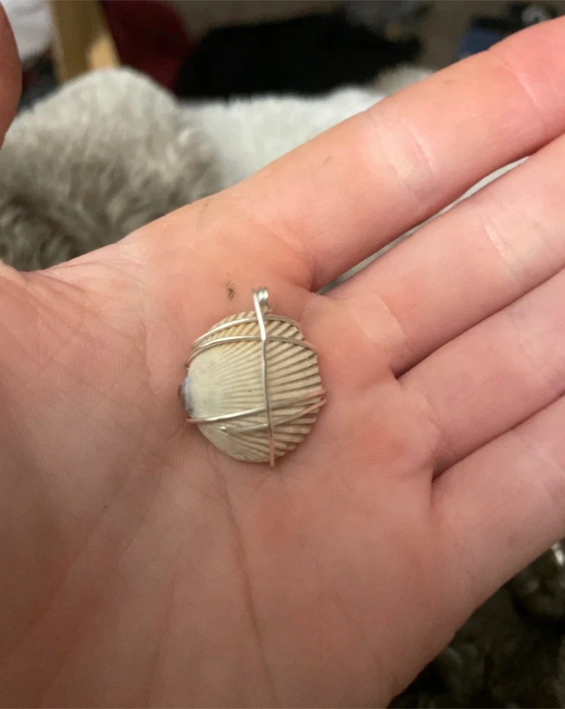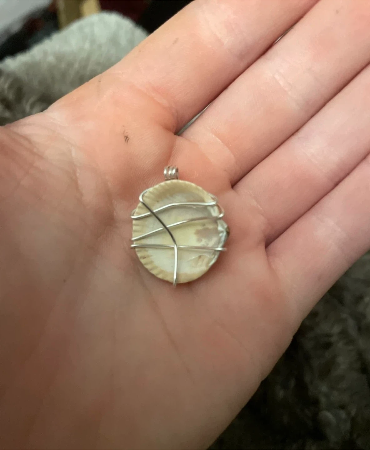 30I'm selling a unique, handmade pendant It features a shell wrapped with silver wire. A lovely piece for anyone who appreciates handcrafted jewelry!