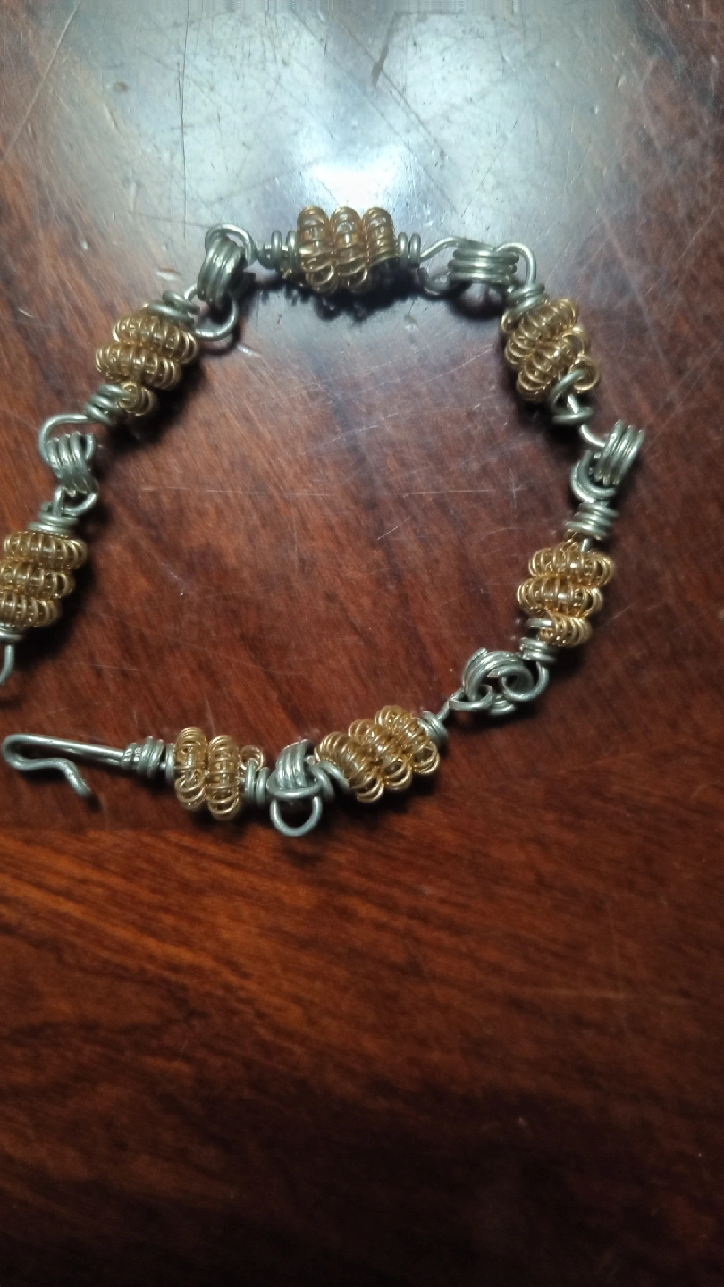35Selling a unique handmade bracelet with silver and gold tone accents! This piece features a hook closure and a distinctive design. It's a lovely accessory to add a touch of artistry to your look