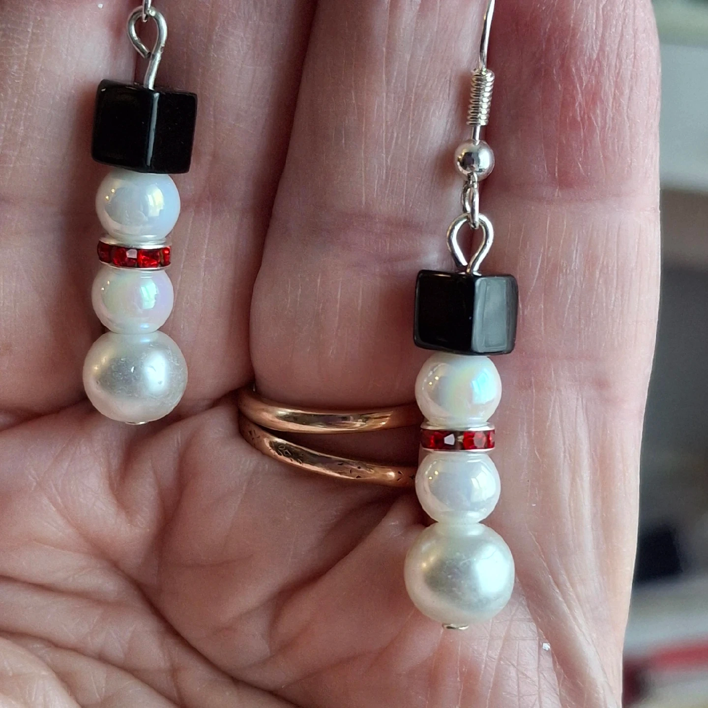 389Cute handmade snowman earrings! These earrings feature a black cube, white pearl beads, and red rhinestone accents. Perfect for the winter season or as a festive gift!