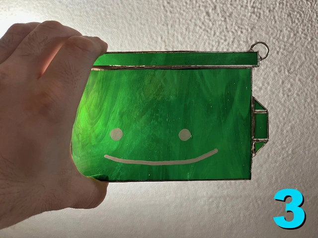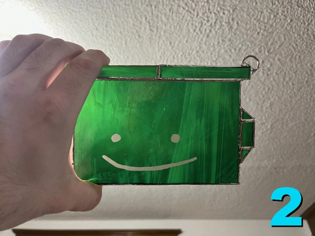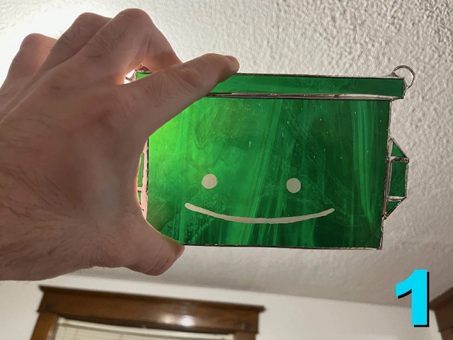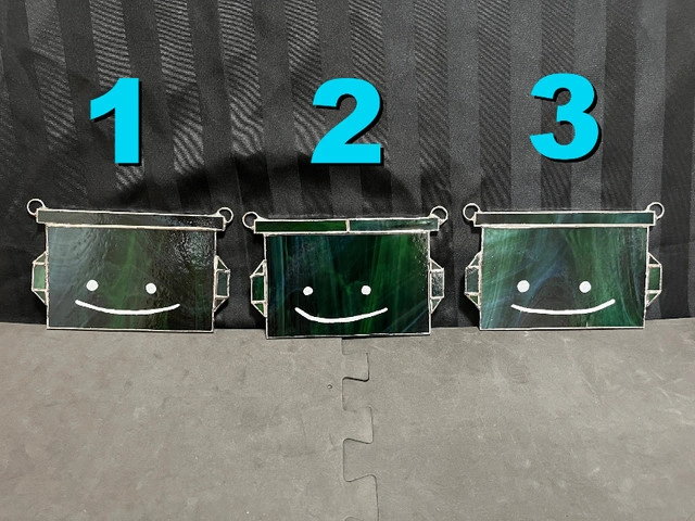 Three new custom handmade silly smiling stained glass dumpsters to choose from. Size: 7" x 4.5" (178mm x 114mm). Care Instructions: Face is painted on with an Oil-based paint marker and is water resistant only. If dirty, clean by wiping with damp cloth, do not scrub near face (else face will come off). I designed and made this pattern from scratch. Please do not copy without permission. Might be willing to sell a digital pattern. Still a little new at stained glass, might not be 100% like someone with decades of experience, please do check pictures and let me know which item number you are interested in. Priced a little lower than I'm seeing similar sized and complexity pieces for as I'm still new and learning. Money is going to more supplies, and glass for future designs. Pickup is on Strange Street in Kitchener (near Grand River Hospital). I'm free weekdays and weekend afternoons and evenings most nights. $25/each. Art prices are firm and are non-negotiable, if prices are out of your budget/price range that is understandable, just please don't be rude about it. I don't drive; Pickup only. Cash or e-Transfer only. No trades.