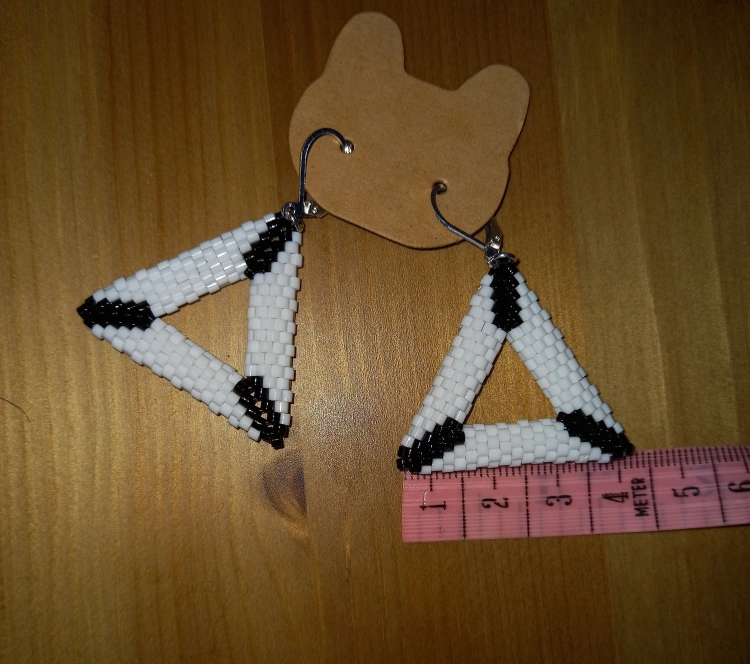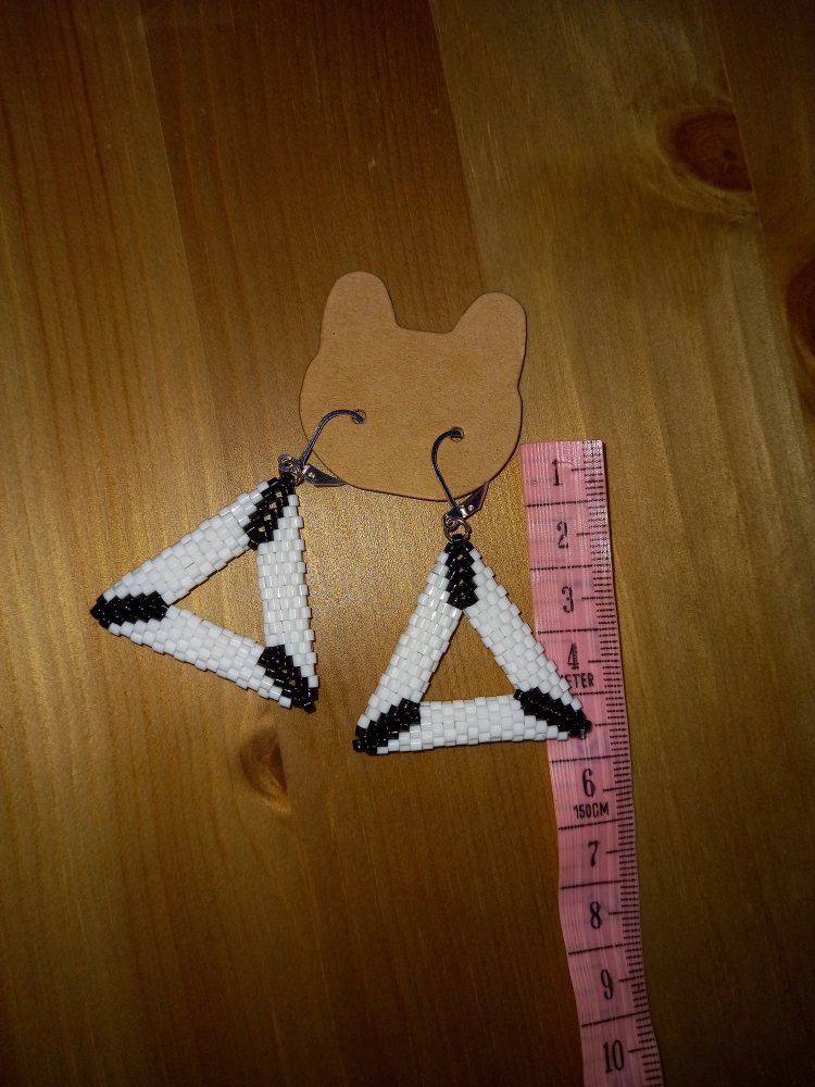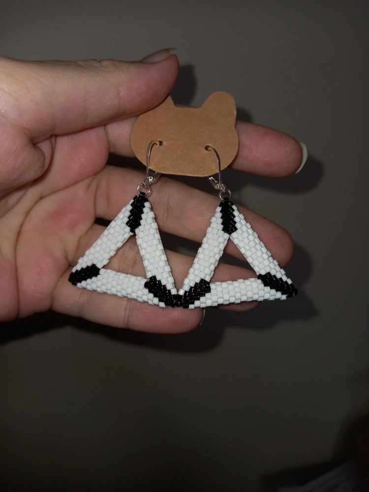 Cute handmade triangle earrings! They're made with white and black beads and have a simple, stylish design. Perfect for adding a little something extra to your outfit