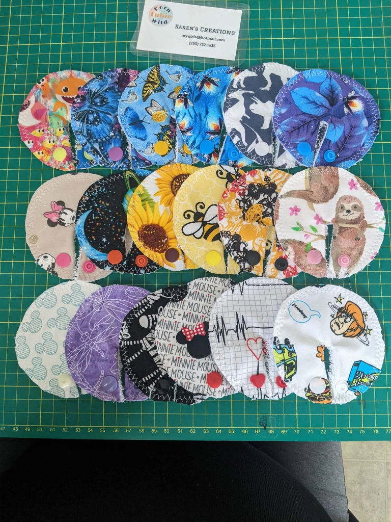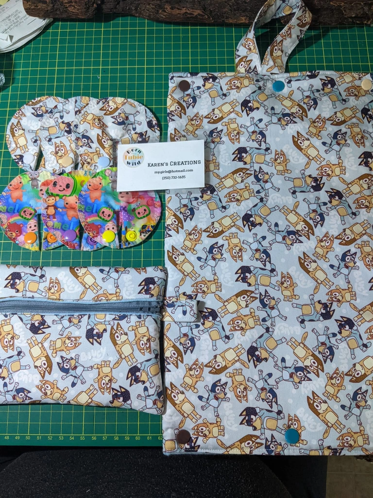 I'm selling a variety of handmade tubie pads and bags. They come in different patterns and sizes. Great for adults or children . Made as ordered