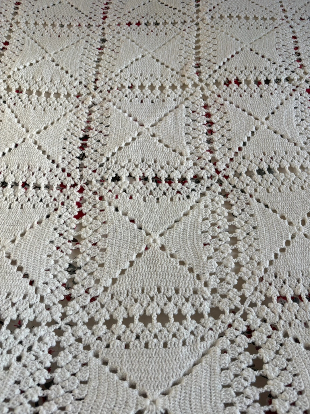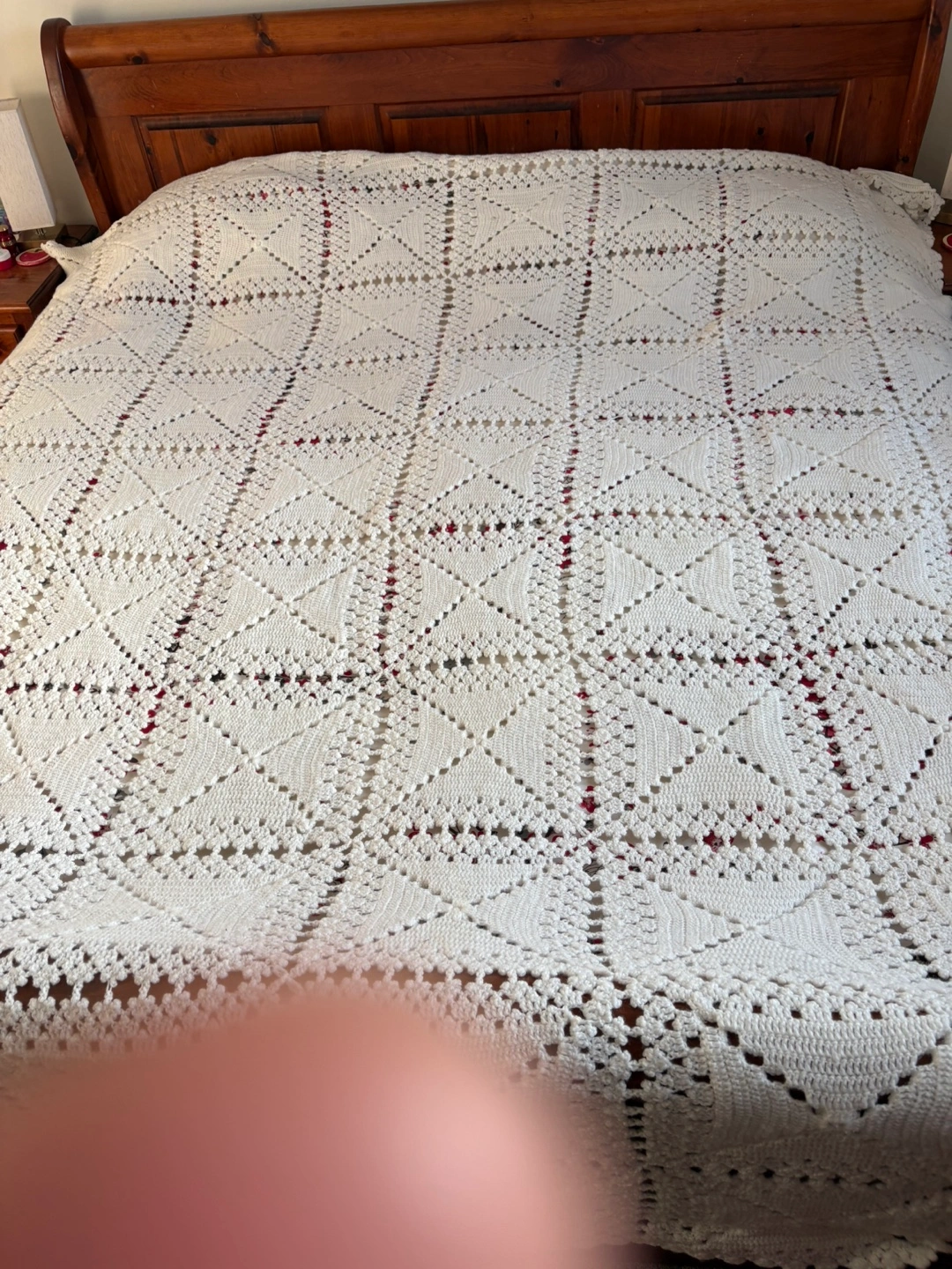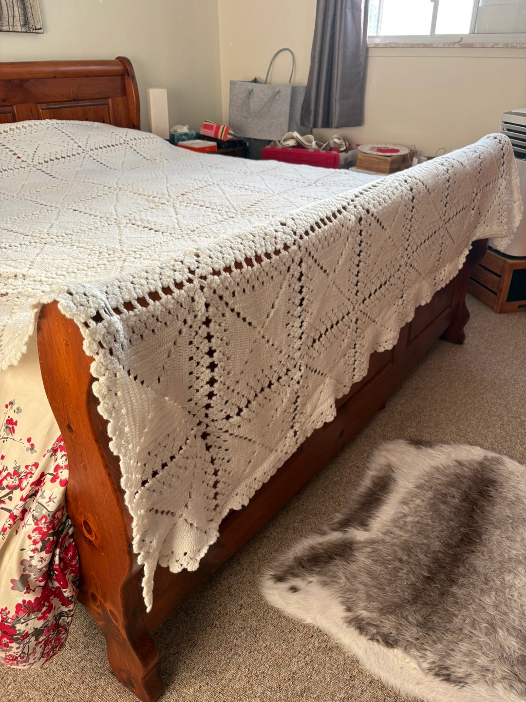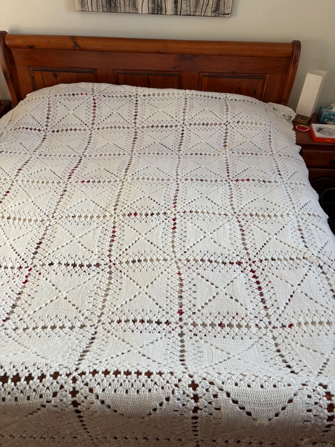Selling a beautiful handmade crochet bedspread! It's a lovely off-white colour with a detailed diamond pattern. Perfect for adding a cozy, vintage touch to your bedroom decor.