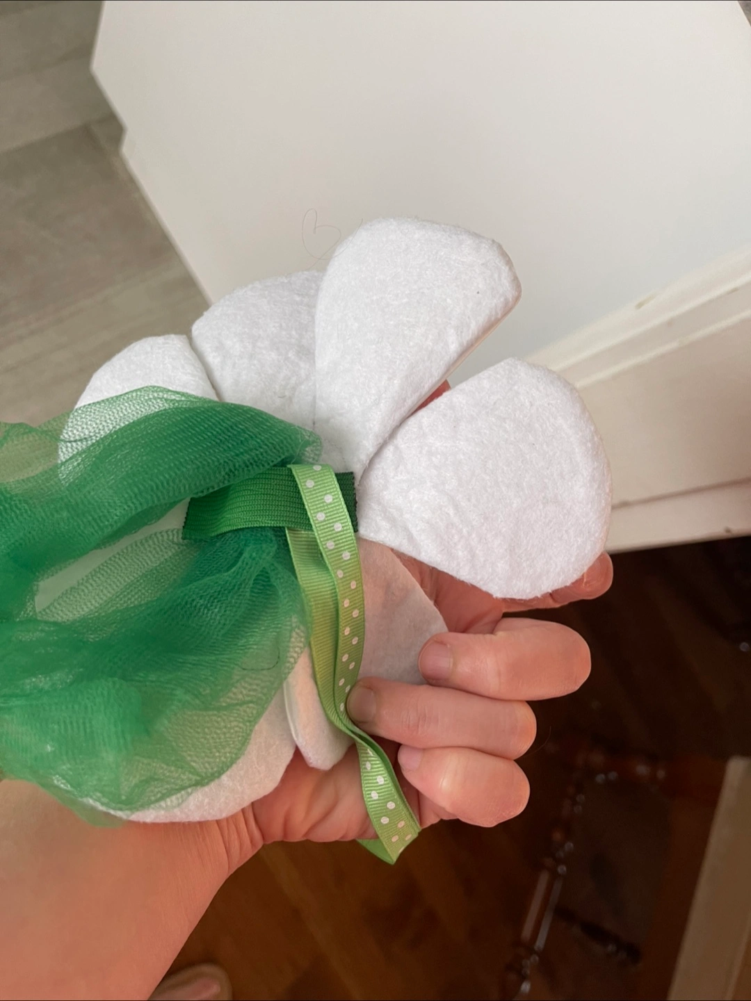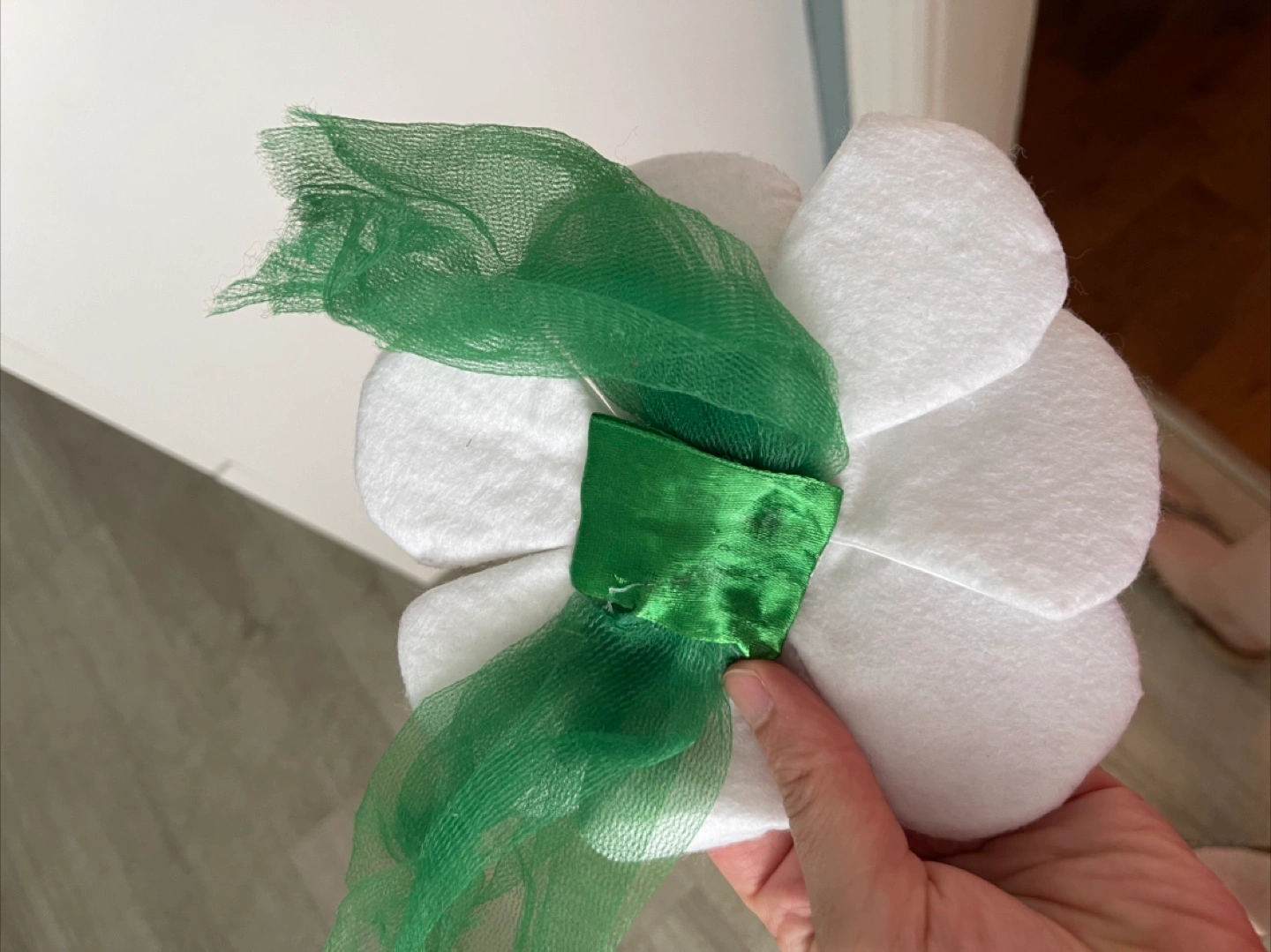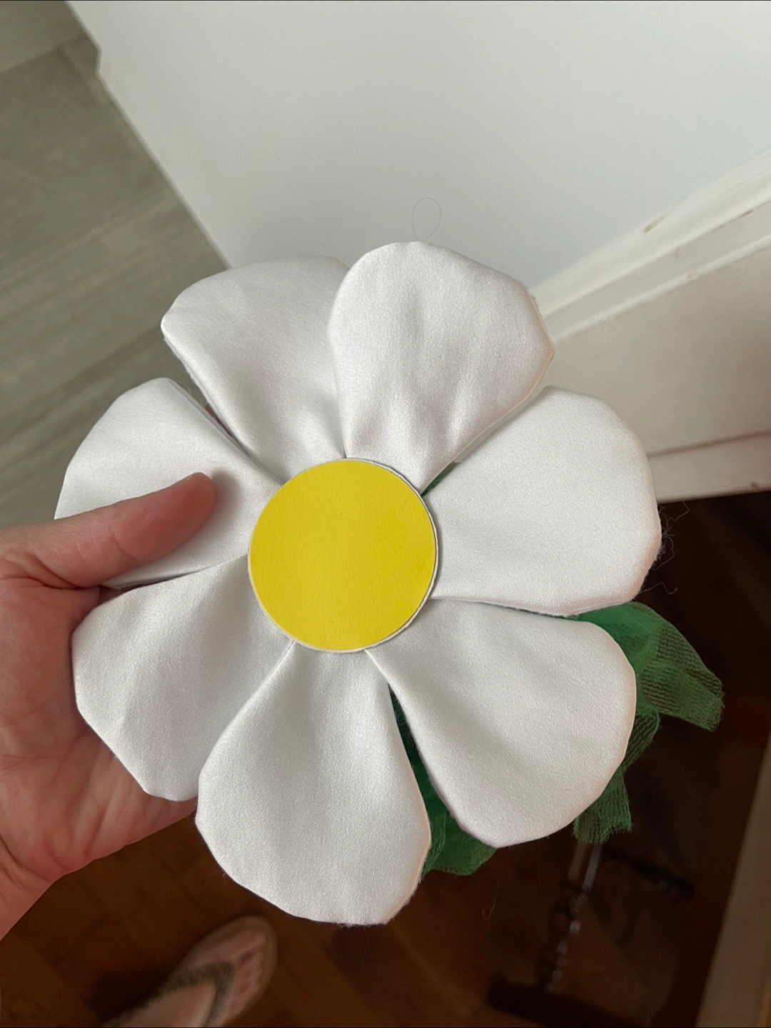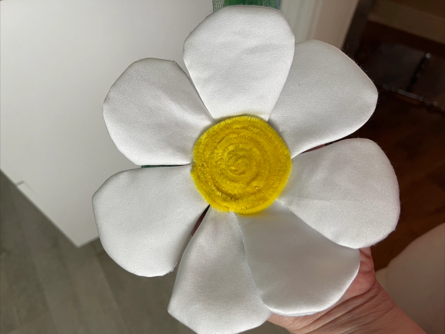 I'm selling a handmade white fabric flower decoration! It has a yellow centre and a green ribbon accent. Perfect for adding a touch of whimsy to any space Completely handmade, many hours of work, suitable as a children's head or as a decoration All together
