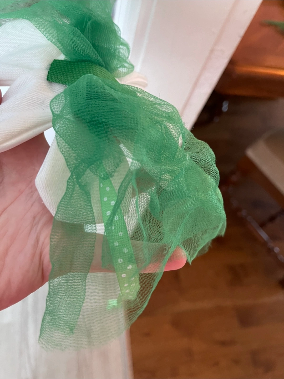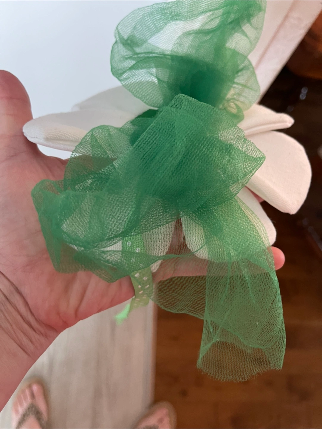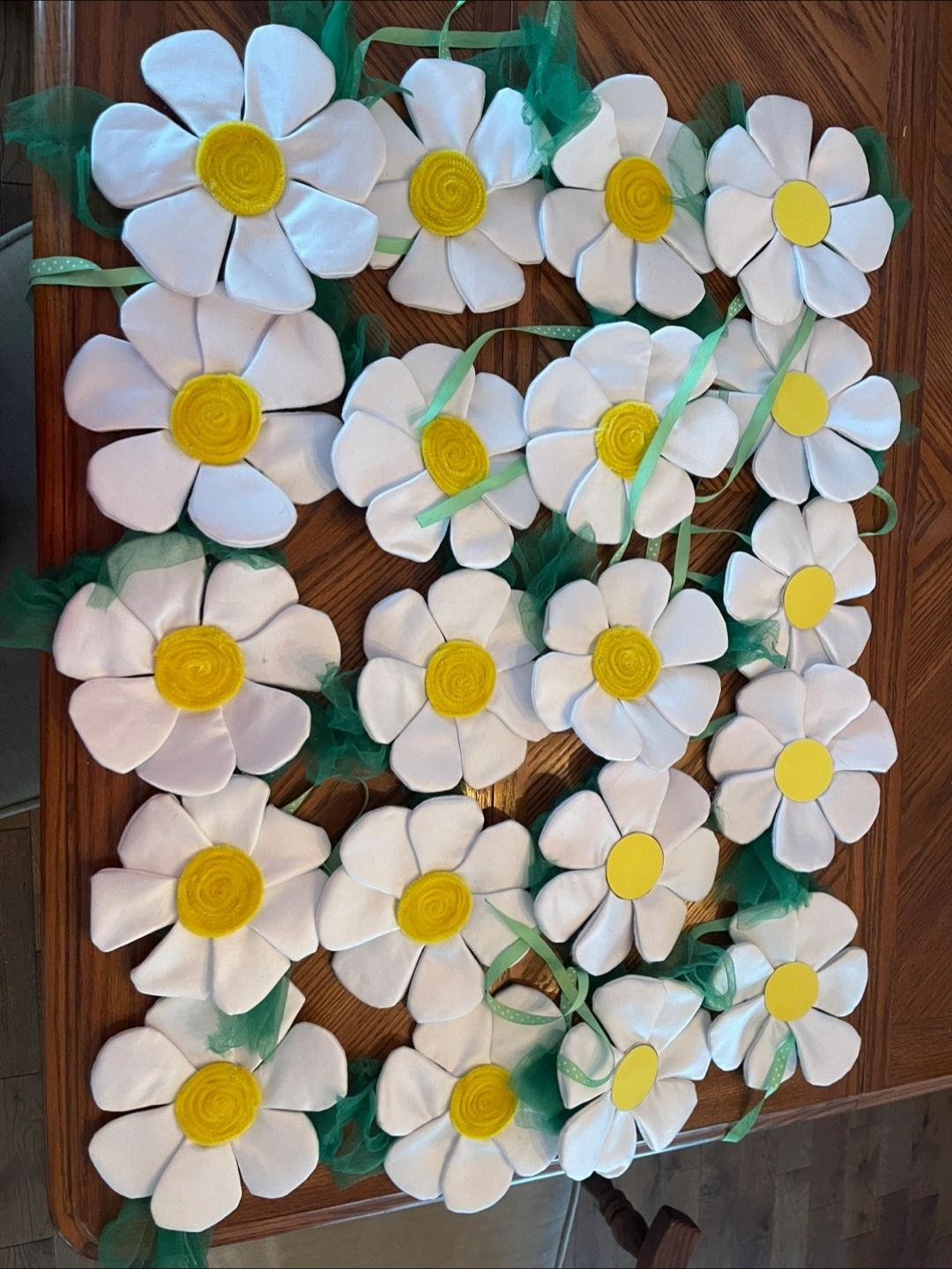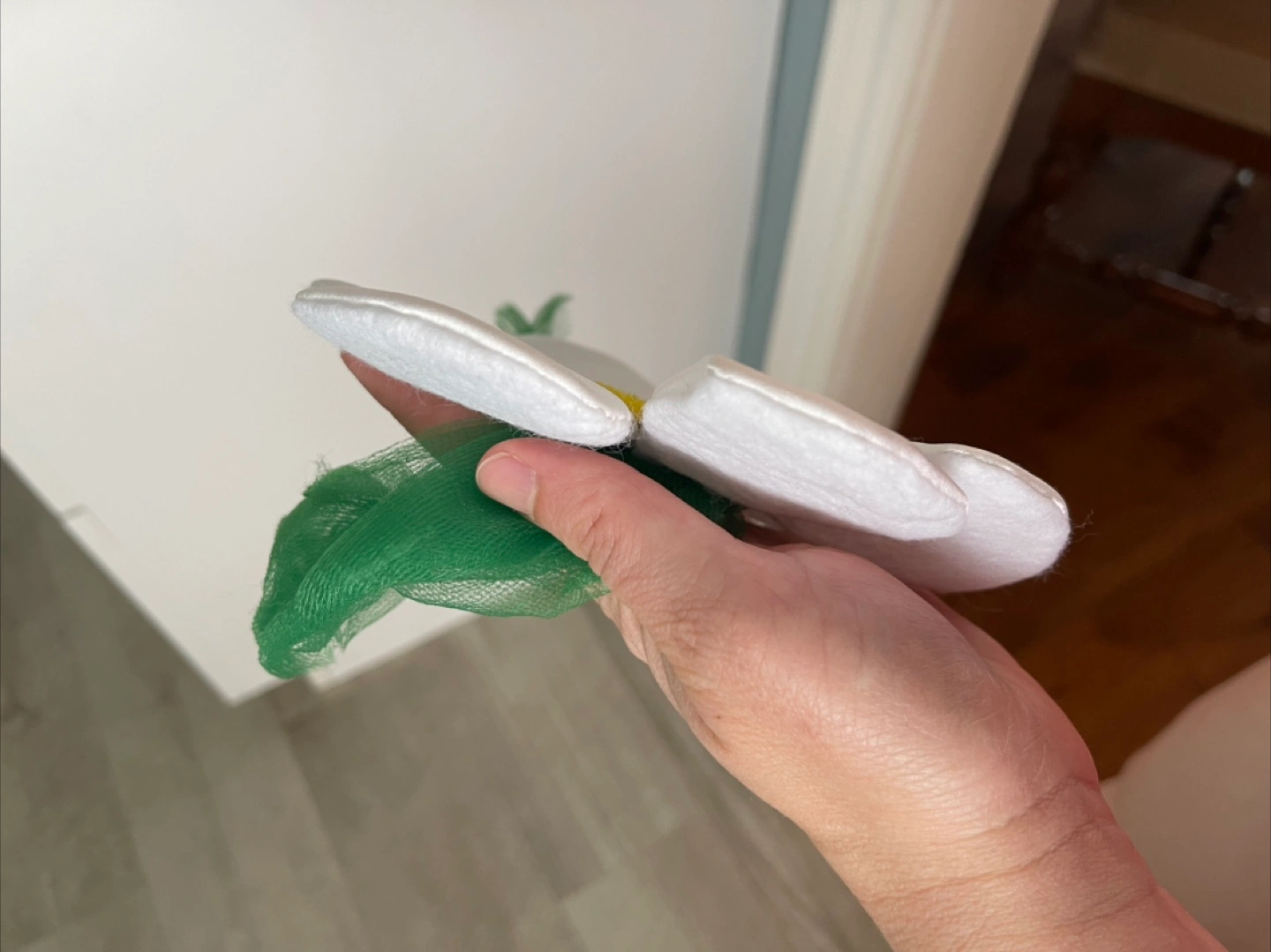 I'm selling a handmade white fabric flower decoration! It has a yellow centre and a green ribbon accent. Perfect for adding a touch of whimsy to any space Completely handmade, many hours of work, suitable as a children's head or as a decoration All together