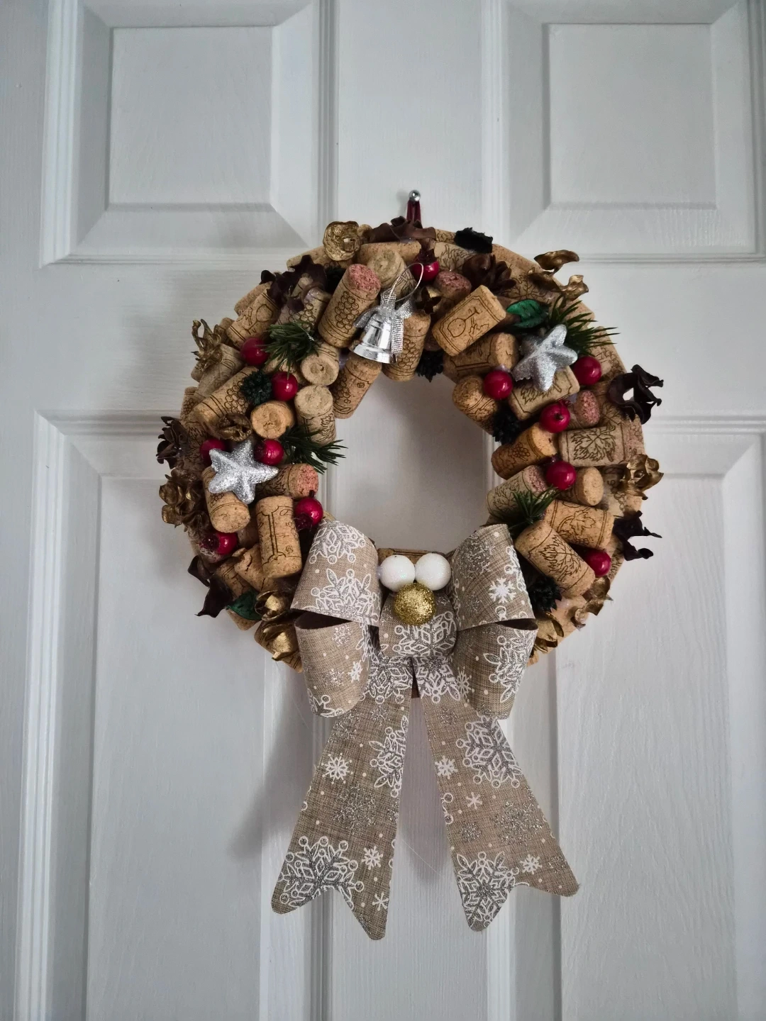 10Selling a unique, handmade wine cork wreath! It's decorated with festive red berries, pine cones, silver stars, and a charming snowflake bow. Perfect for adding a touch of rustic elegance to your home this holiday season!