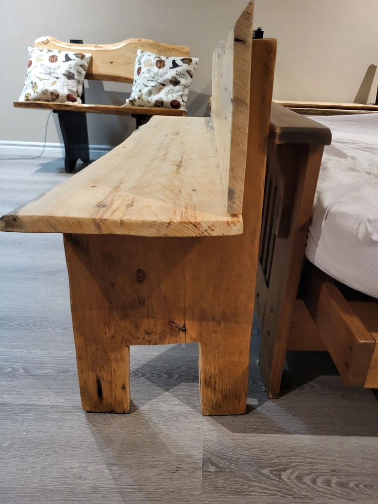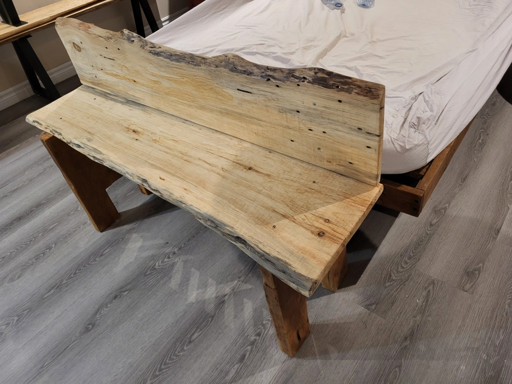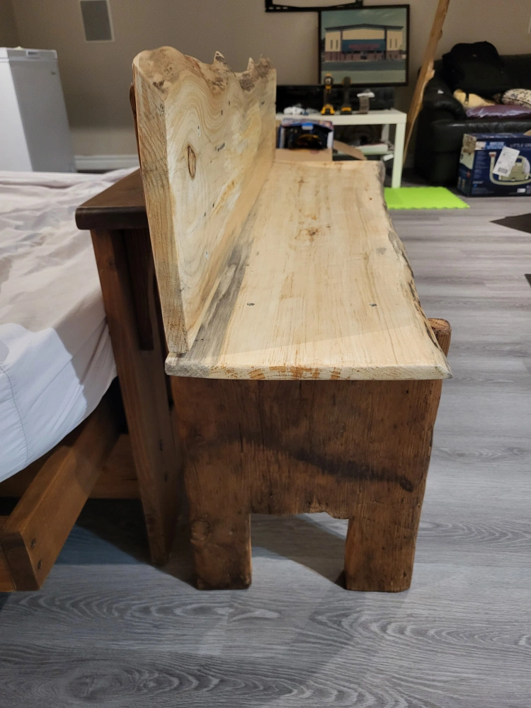 Selling a unique, handmade wooden bench! It's sturdy and has a beautiful natural wood finish. The bench is approximately 48 inches long and 13 inches wide, making it a great accent piece for any room. It has the live edge pine. The legs are made from 100+ year old barn board. Can deliever for a fee.