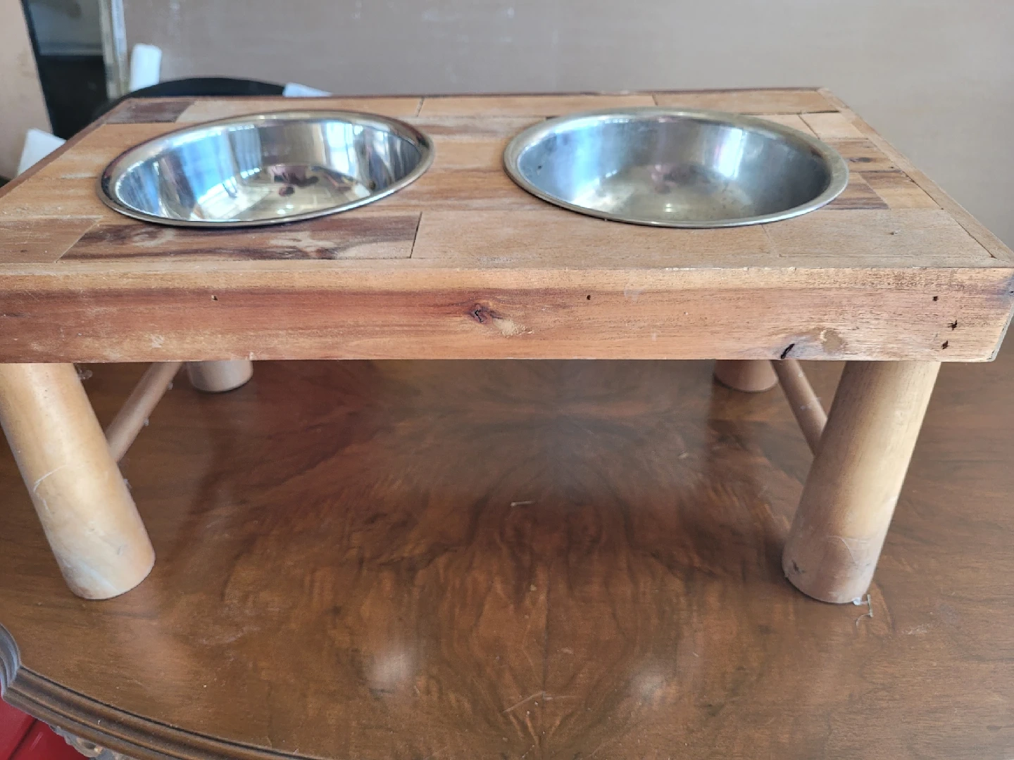 10Selling a handmade wooden double pet bowl stand. It's a unique piece with a rustic look, perfect for your furry friends. The stand features two stainless steel bowls set into a wooden frame. Great for keeping food and water organized and off the floor!
