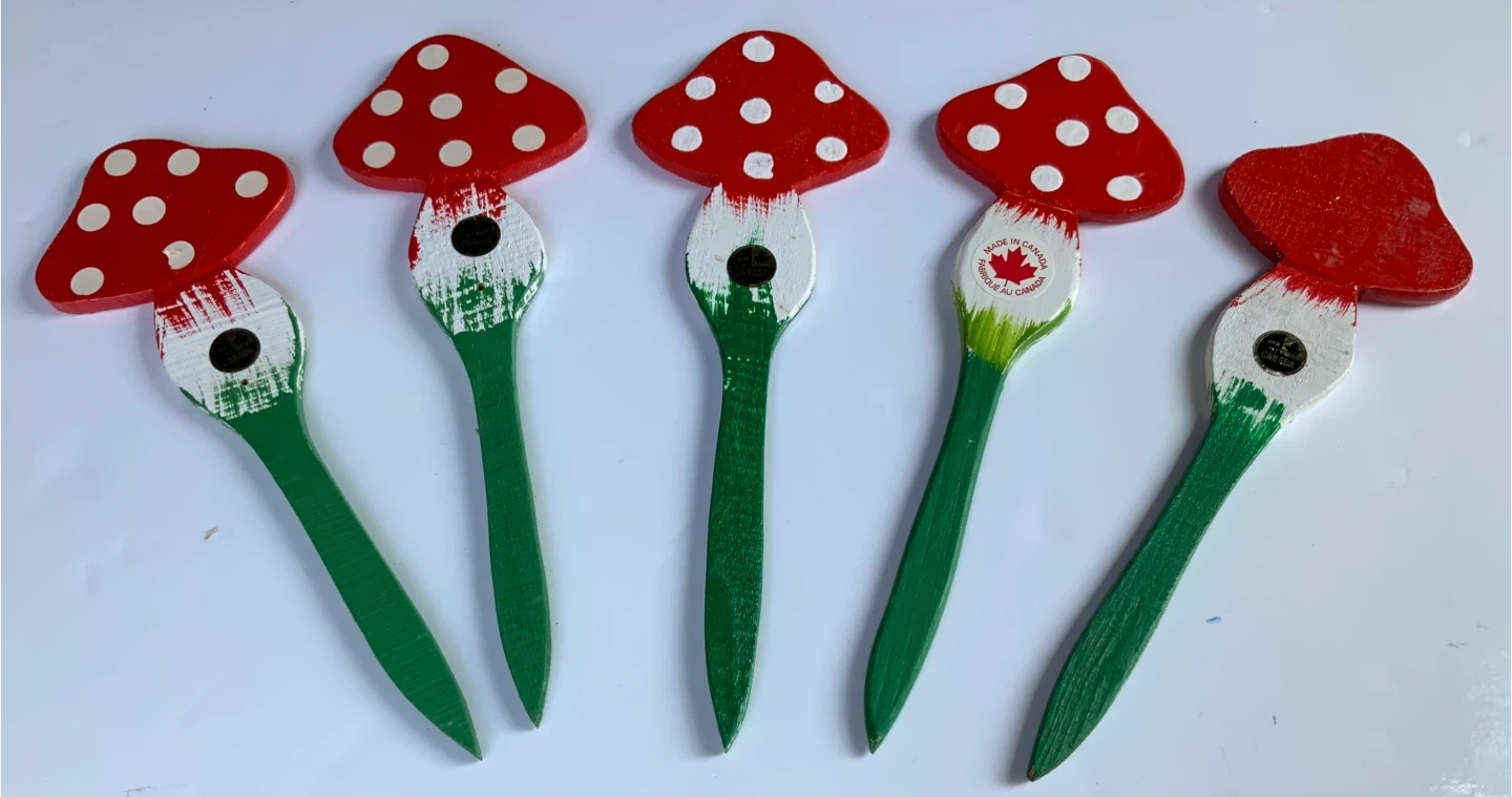 Here's a cute set of five handmade wooden mushroom garden stakes! They have a red and white spotted mushroom cap and a green stem. Perfect for adding a touch of whimsy to your garden or potted plants 11 inches Each $10