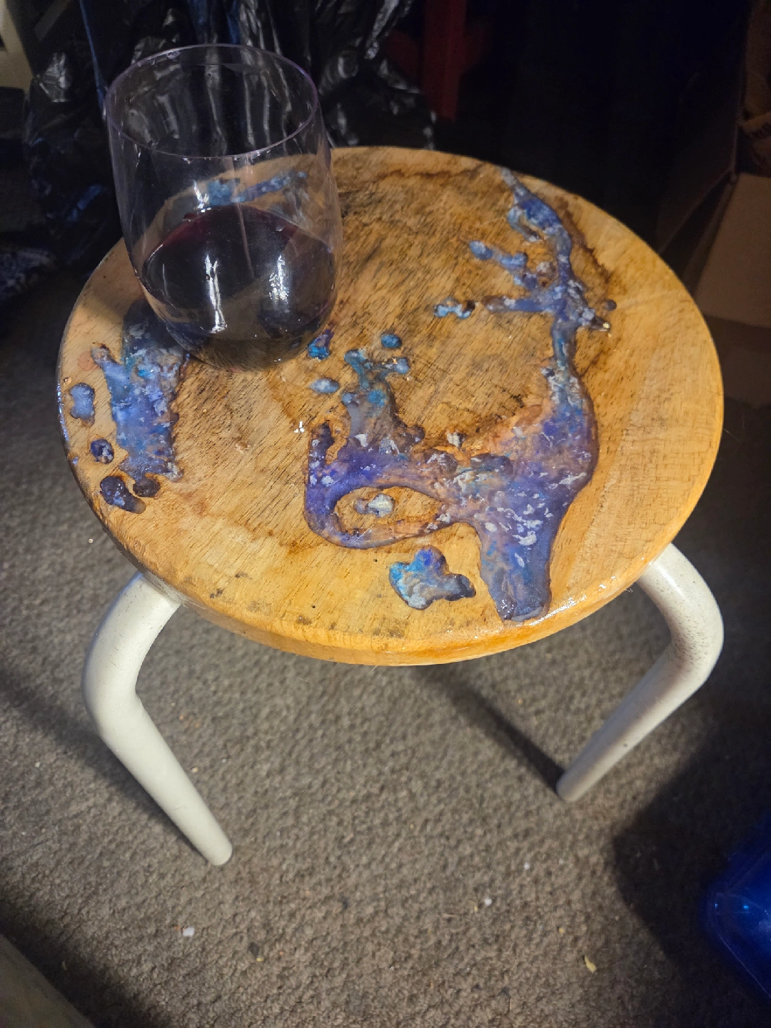 Selling a unique, Blue River Resin Stool / Handcrafted Wood Accent Table Elevate your space with this one-of-a-kind wooden stool. The surface features a stunning, hand-poured blue epoxy resin design that flows like a miniature river. It's a functional art piece, perfect as a sturdy side table, plant stand, unique nightstand, or eye-catching extra seat.!