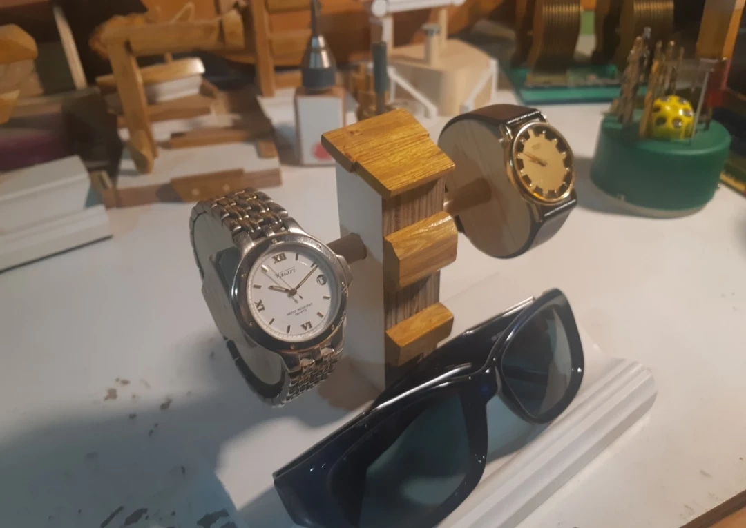 34Check out this handmade wooden display stand! It's perfect for showcasing your favourite watches and sunglasses. It's a unique and stylish way to keep your accessories organized and easily accessible. The stand is sturdy and well-crafted, adding a touch of rustic charm to any room Custom designed double watch and sunglasses display stand. Accented with rare golden Kentucky Yellowwood.